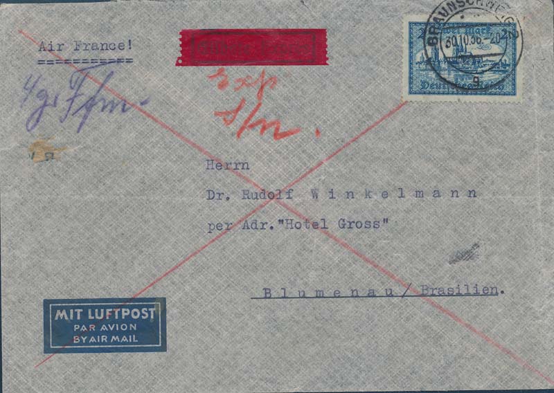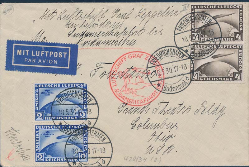 4 RM Südamerikafahrt Wz "X" u. 50 Pf. Flp.-Ausg. 1926 zusammen auf Zeppelinkarte mit Bordpoststpl. vom 19.5.30 in die USA |