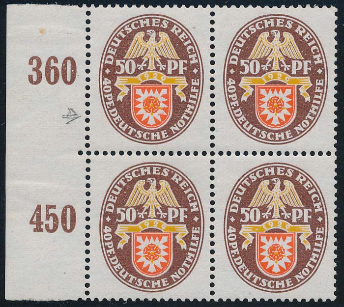 Nothilfe 1930 je im l. obere Bogenecke postfrisch Pracht ungefaltet u. unsign., 1 mal 25 Pf. stärkerer Gummibug |