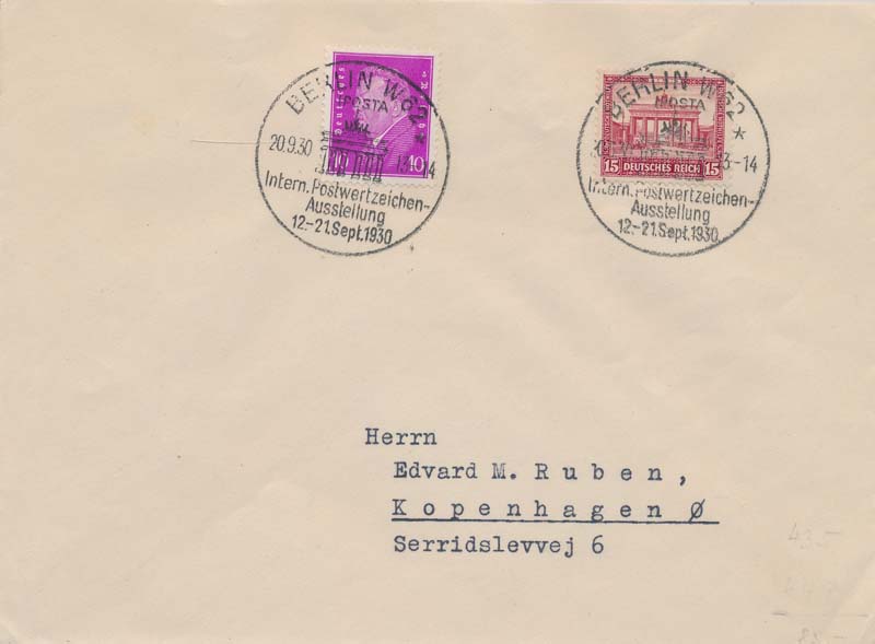 15 Pf. Marke aus IPOSTA-Block sowie 10 Pf. Präsidenten zusammen auf Auslandsbf. ab Berlin vom 20.9.30 nach Dänemark |