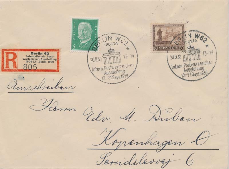 50 Pf. Marke aus IPOSTA-Block sowie 5 Pf. Präsidenten zusammen auf Auslands-R-Bf. ab Berlin vom 20.9.30 nach Dänemark |