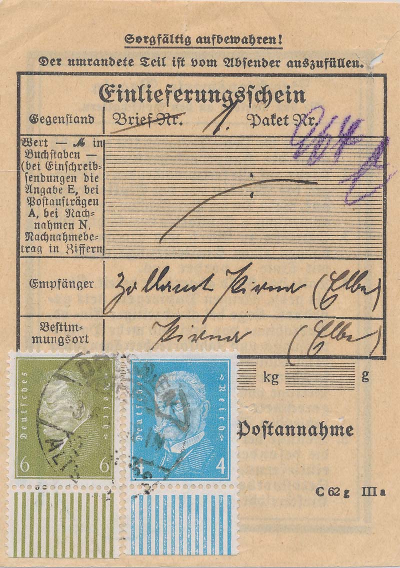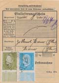 4 u. 6 Pf. Präsidenten Erg.-Werte je vom Unterrand im Walzendruck auf Einlieferungsschein von Dresden vom 3.6.... über 1 Paket Schein kl. Einriße |