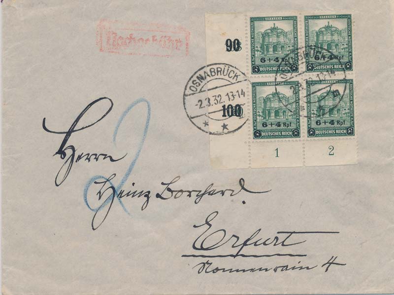 6 a. 8 Pf. Nothilfe 1932 im l. untere Bogenecke als MeF auf Bf. ab Osnabrück vom 2.3.32 nach Erfurt, da 1 Pf. zu wenig mit 2 Pf. Nachgebühr belegt |