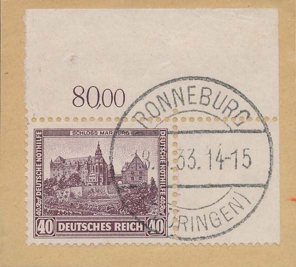 40 Pf. Nothilfe 1932 r. obere Bogenecke ideal gestpl. auf Bf.-St. LUXUS! |