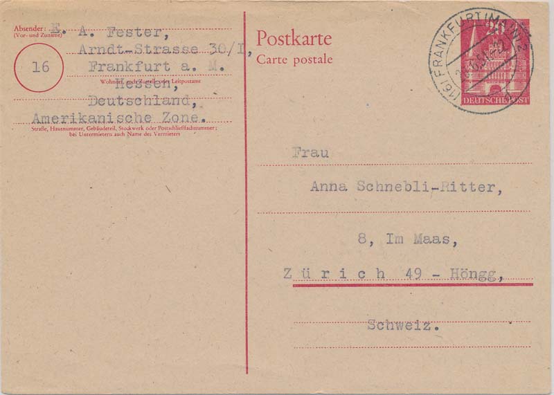 20 Pf. Bauten gebr. ab Frankfurt/M. vom 20.10.51 in die Schweiz viel Text! |