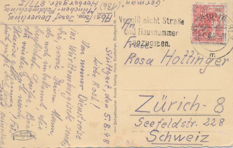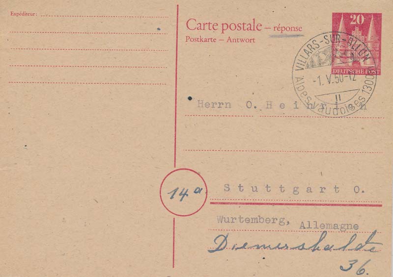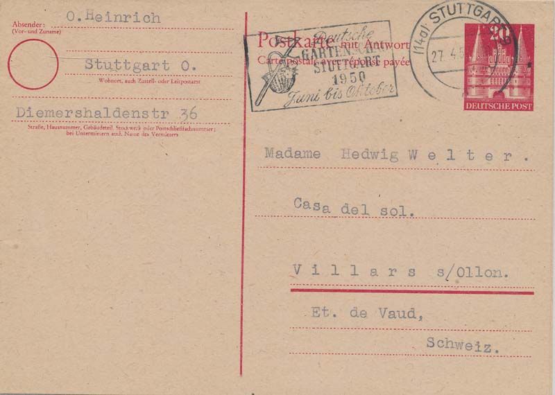 20 Pf. Bauten Doppelkarte gebr. ab Stuttgart vom 27.4.50 nach Villars/Schweiz u. von dort am 1.5.50 zurück nach Stuttgart, beide Karten viel Text! |
