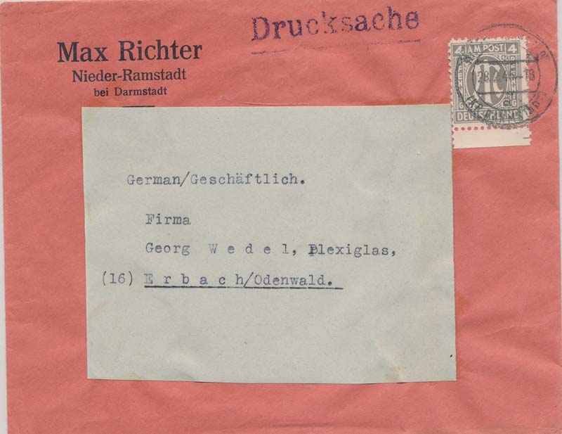 4 Pf. AM-Post am. Druck "y"-Papier vom Unterrand als EF auf Drucksache ab Nieder-Ramstadt vom 28.2.46 nach Erbach |