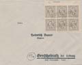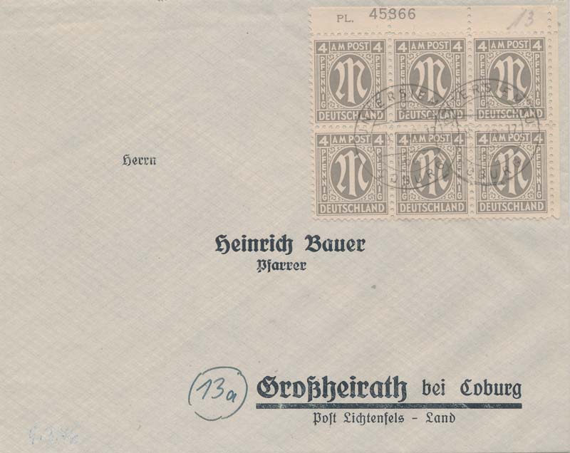 4 Pf. AM-Post am. Druck "z"-Papier im waager. 6er Block vom Oberrand mit Pl.-Nr. 45866 als MeF auf Bf. ab Untersiemau vom 9.3.46 nach Großheirath |