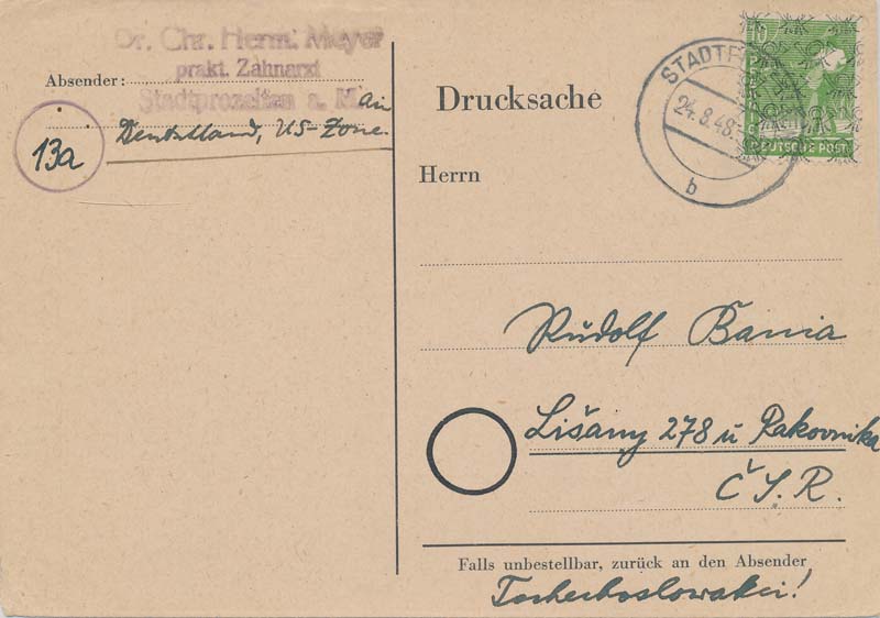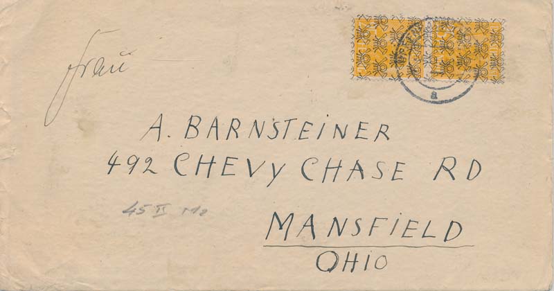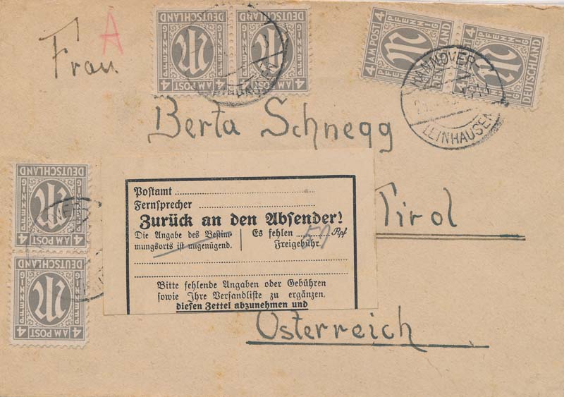 4 Pf. AM-Post am. Druck als MeF von 6 St. auf Auslandsbf. ab Hannover vom 23.4.46 nach Österreich u. zurück mit Aufkleber "Zurück an Absender! Es fehlen 51 Rpf Freigebühr" |