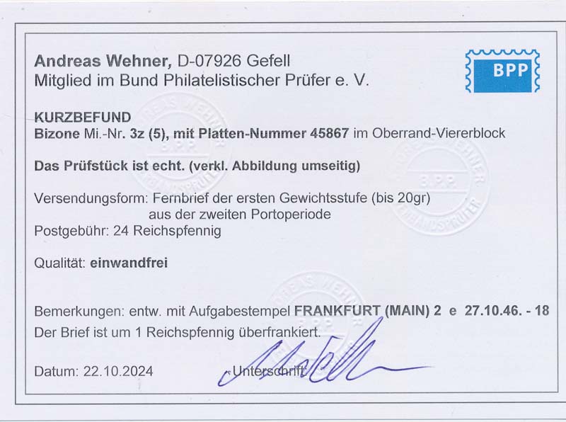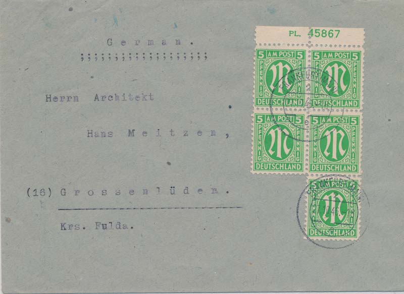 5 Pf. AM-Post am. Druck im 5er Block vom Oberrand mit Pl.-Nr. 45867 als MeF auf Bf. ab Frankfurt/M. vom 27.10.46 nach Grossenlüder 1 Pf. zuviel neuer Kurzbefund Wehner "echt u. einwandfrei" |