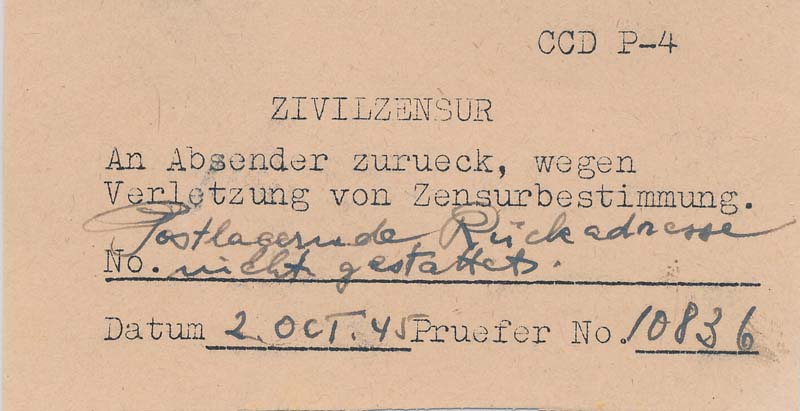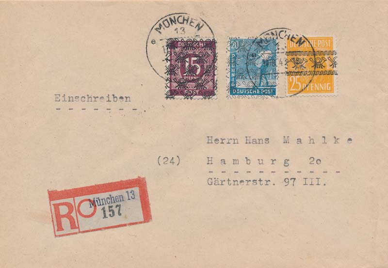 5, 12 u. 25 Pf. AM-Post am. Druck zusammen auf R-Bf. ab Ahrensberg vom 27.9.45 nach Rain u. zurück mit Einlagezettel "CCD P.4" "Postlagernder Rückadresse nicht gestattet! |