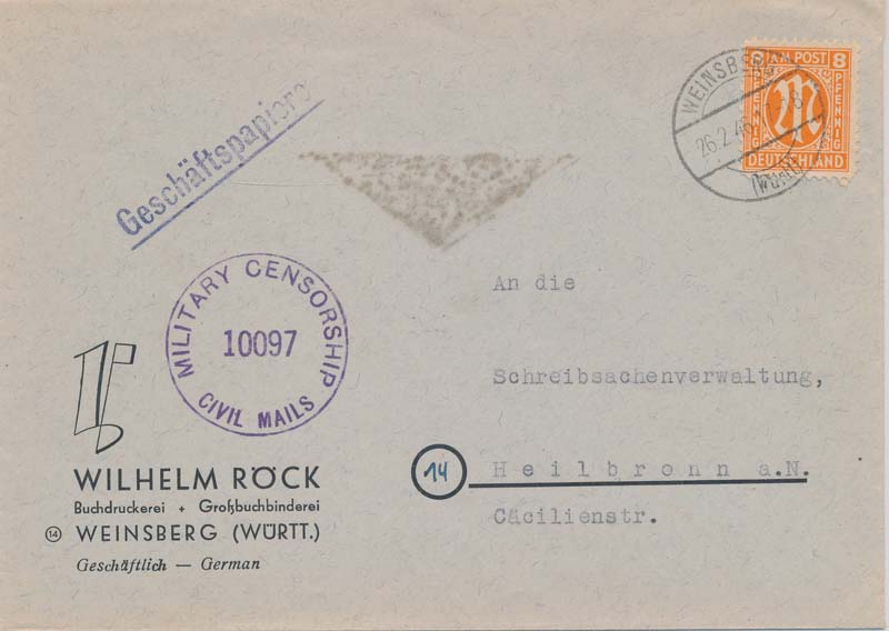 8 Pf. AM-Post am. Druck "z"-Papier als EF auf Geschäftspapiere ab Weinsberg vom 26.2.46 nach Heilbronn mit Zensur |