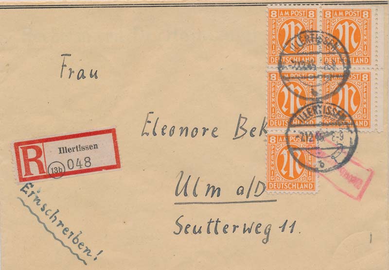 8 Pf. AM-Post am. Druck "z"-Papier im 5er Block u. Ra1 "Gebühr bez." zusammen auf R-Bf. ab Illertissen vom 7.12.45 nach Ulm |