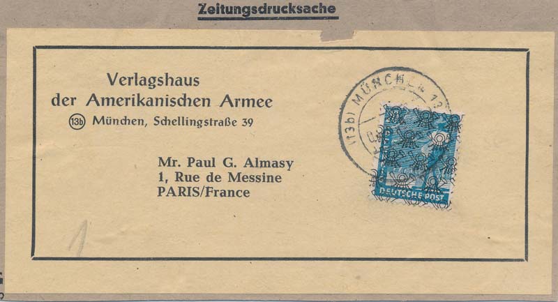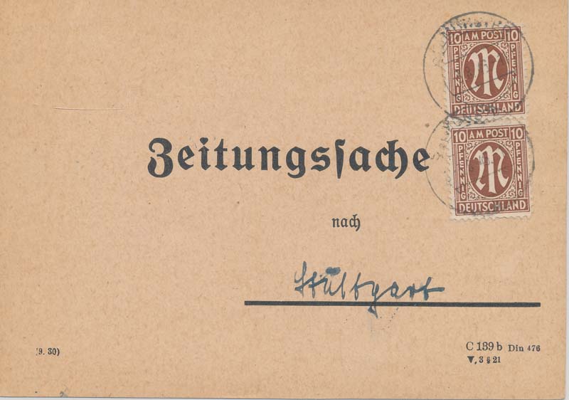 10 Pf. AM-Post am. Druck im als MeF auf Zeitungssache ab Salmünster vom 3.8.46 nach Stuttgart seltene MeF-Variante! |