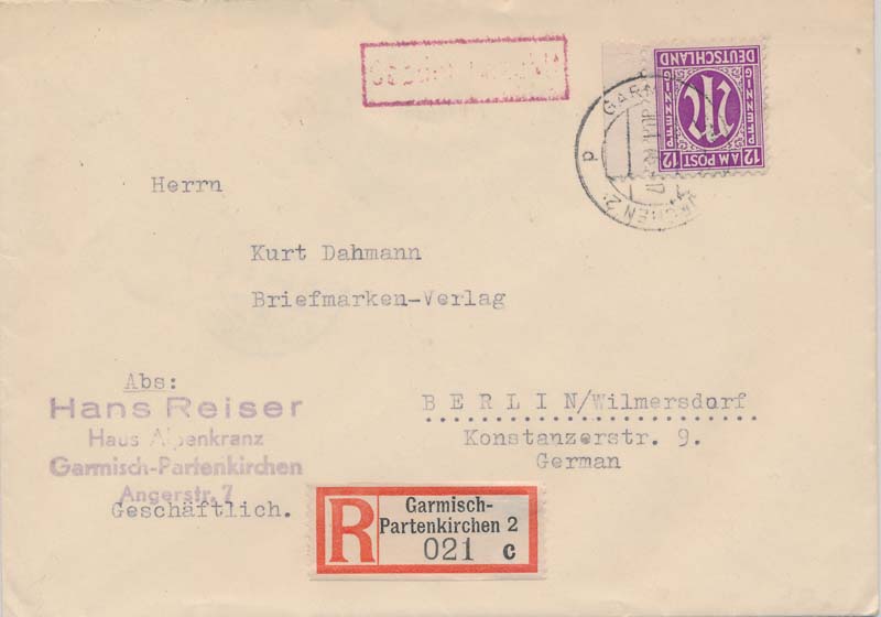 12 Pf. AM-Post am. Druck "za"-Papier "b"-Farbe u. Ra1 "Gebühr bezahlt" zusammen auf R-Bf. ab Garmisch-Partenkirchen vom 10.1.46 nach Berlin |