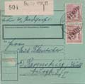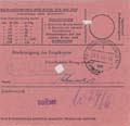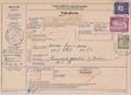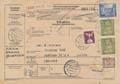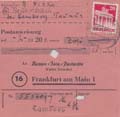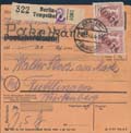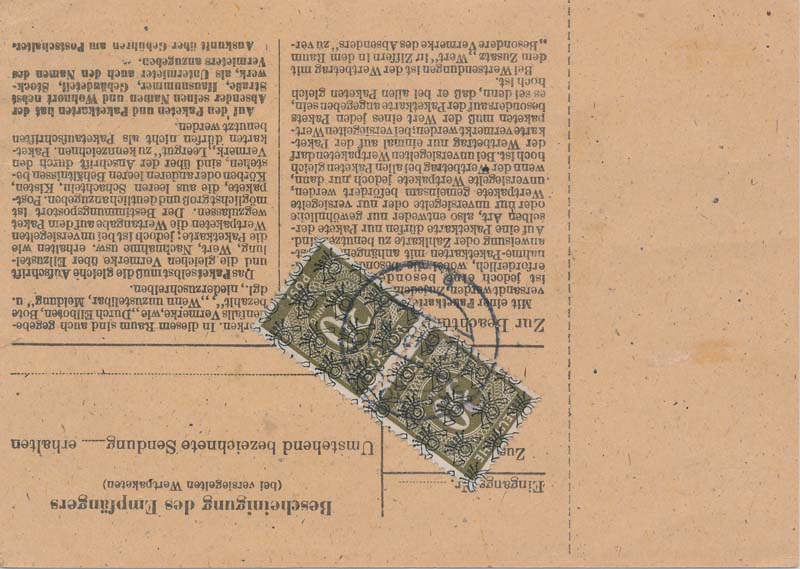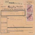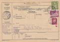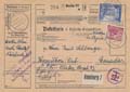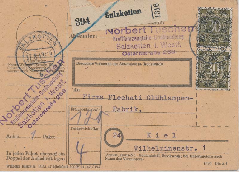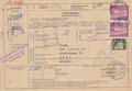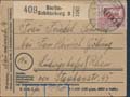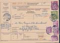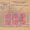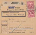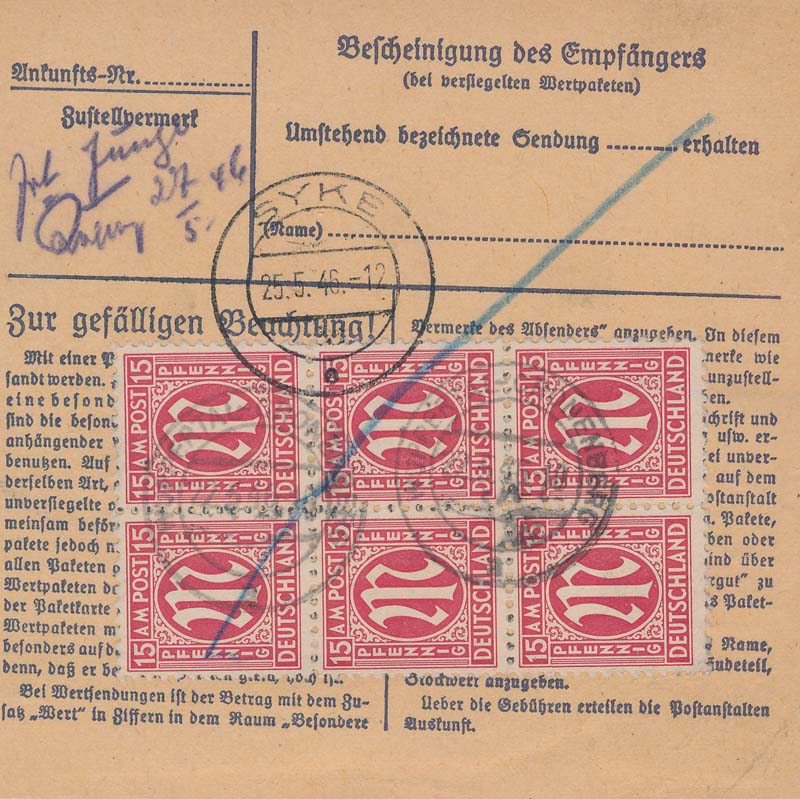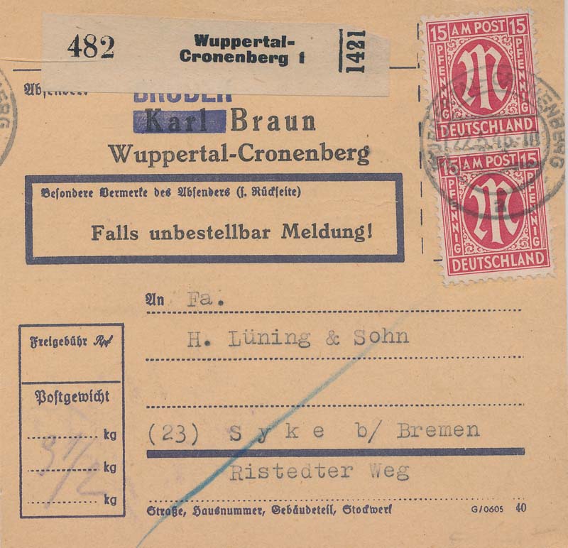 15 Pf. AM-Post am. Druck "z"-Papier als MeF von 8 St. (vorder u. rücks. frankiert) auf Paketkarte ab Wuppertal-Cronenberg vom 22.5.46 nach Syke |