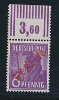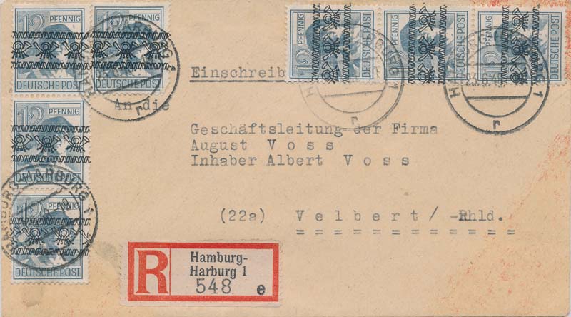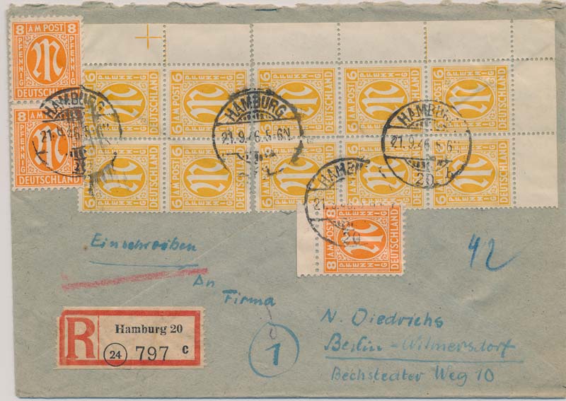 6 Pf. AM-Post eng gez. "A"-Zähnung im u. 6er Block (r. untere Bogenecke) sowie 3 mal 8 Pf. am. Druck zusammen auf R-Bf. ab Hamburg vom 21.9.46 nach Berlin |
