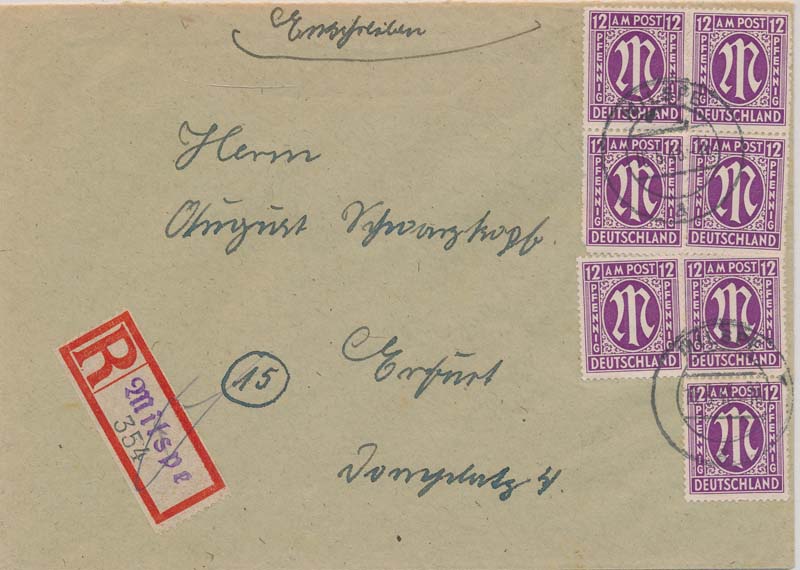 12 Pf. AM-Post eng gez. "A"-Zähnung "z"-Papier als MeF von 7 St. auf R-Bf. ab Milspe vom 16.5.46 nach Erfurt |