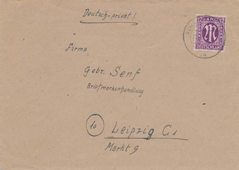 12 Pf. AM-Post eng gez. "G"-Zähnung als EF auf Bf. ab Schöppenstedt vom 12.1.46 nach Leipzig gepr. Hettler |