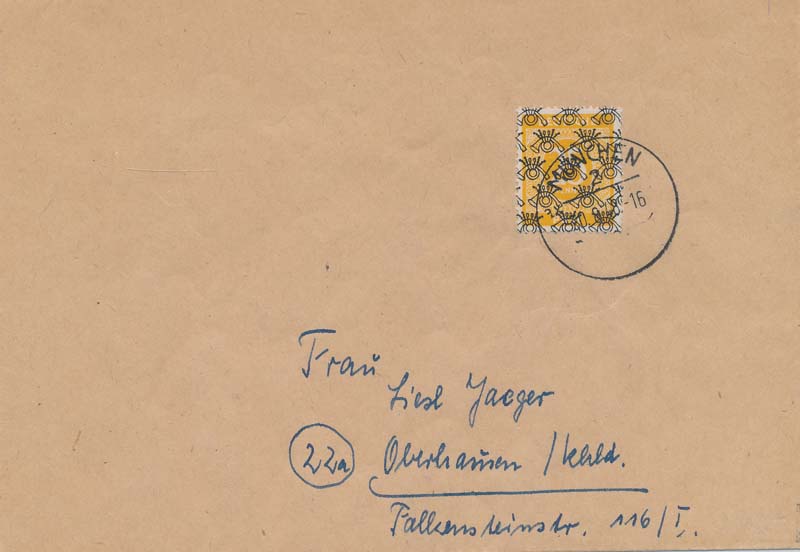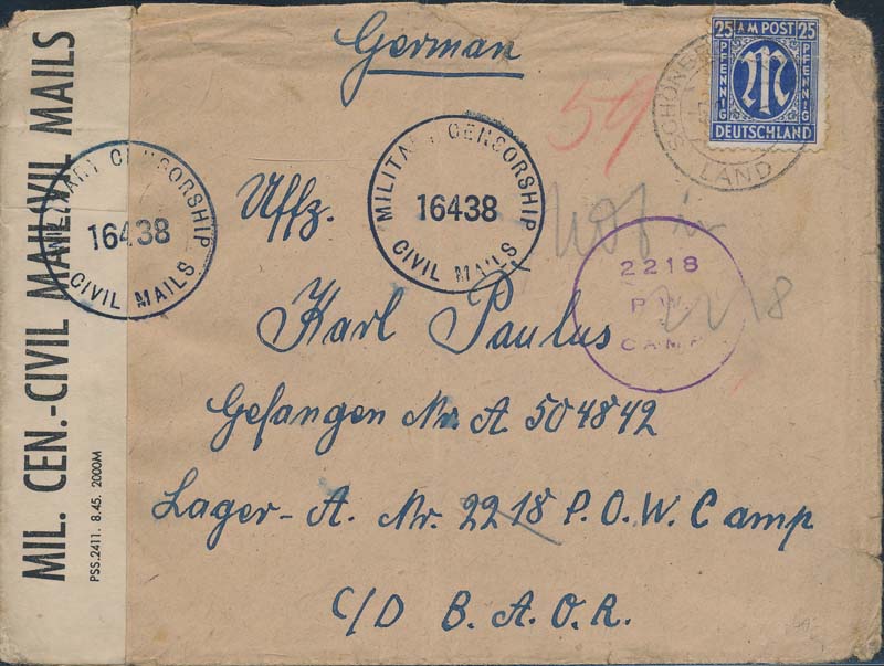 25 Pf. AM-Post dt. Druck als EF auf Kriegsgefangenenbf. ab Schönberg vom 5.2.46 Umschlag Faltbug u. insges. etwas Spuren mit Zensur gute EF-Variante! |