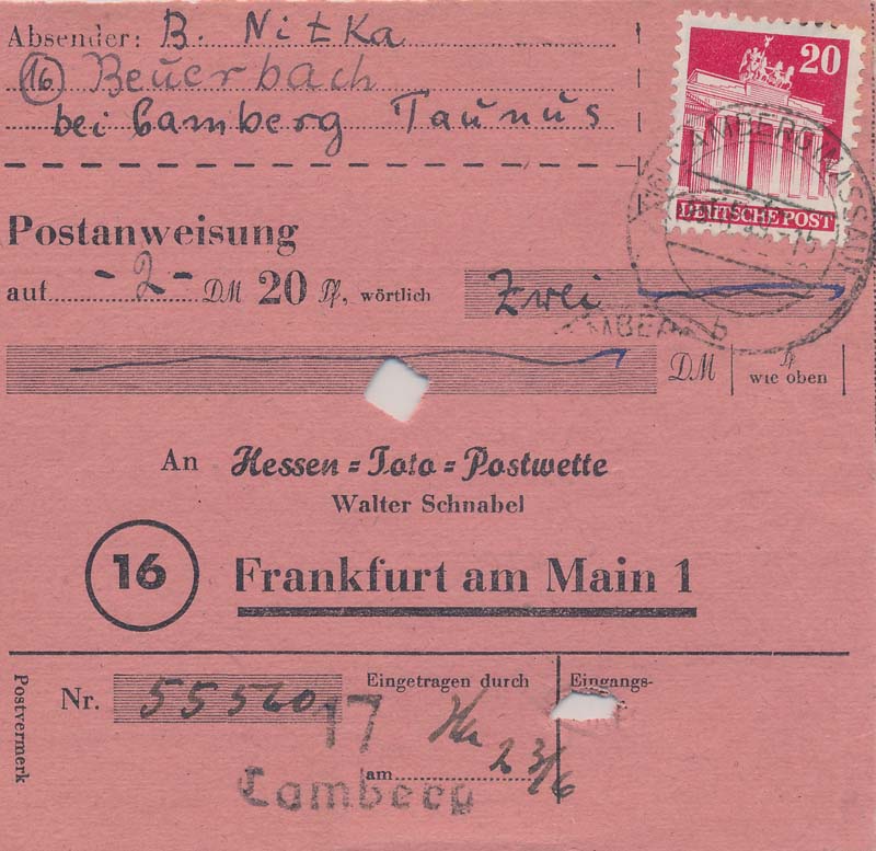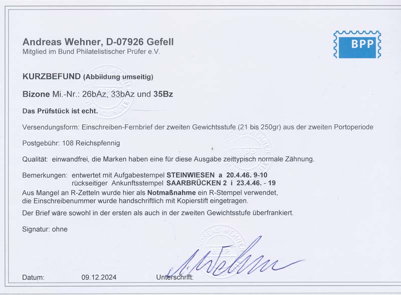 20 u. 60 Pf. sowie 1 RM AM-Post dt. Druck zusammen auf R-Bf. ab Steinwiesen vom 20.4.46 nach Saarbrücken, überfr. nur Marken bewertet! neuer Kurzbefund Wehner "echt u. einwandfrei, normale Zähnung" |