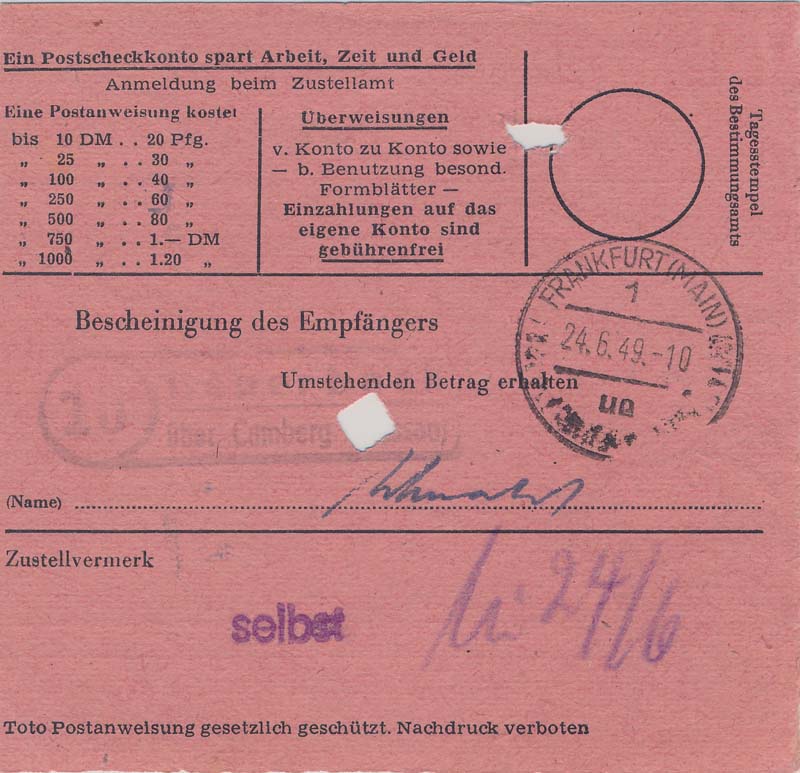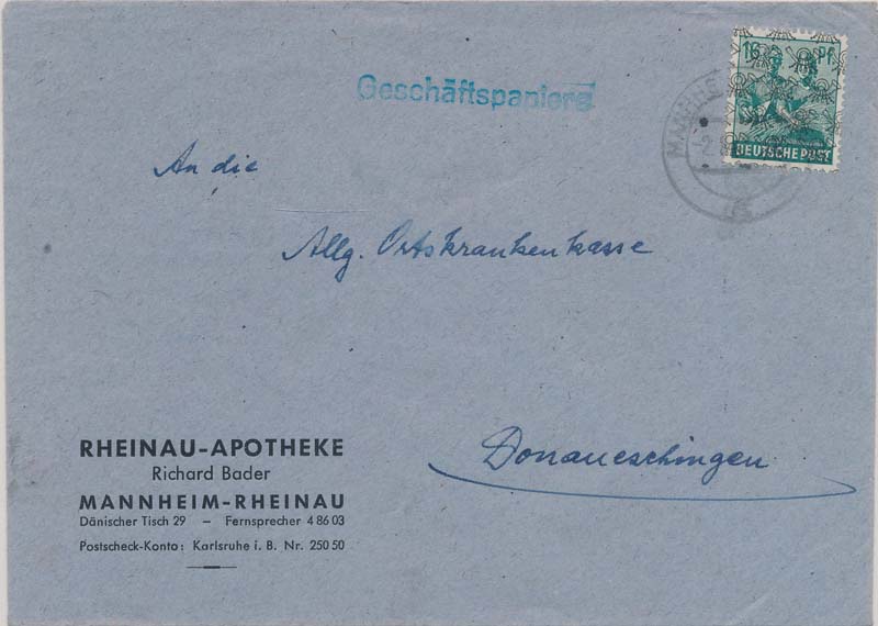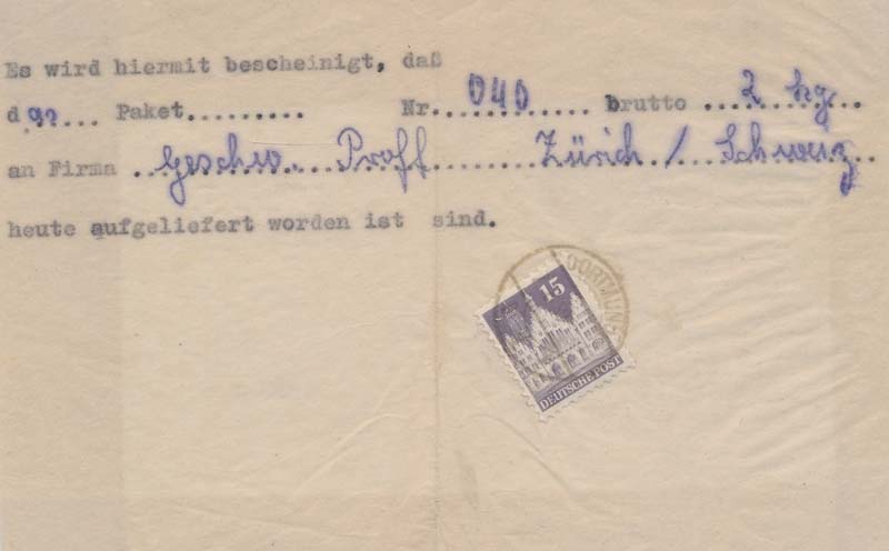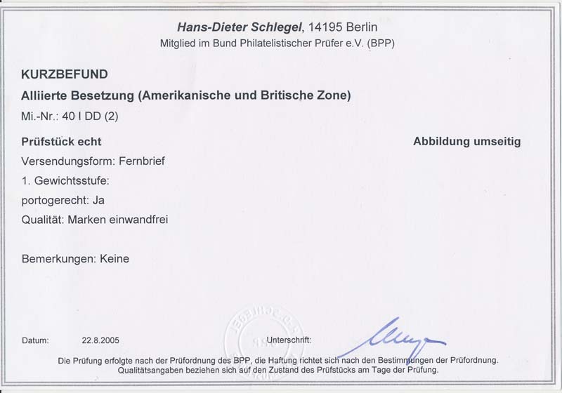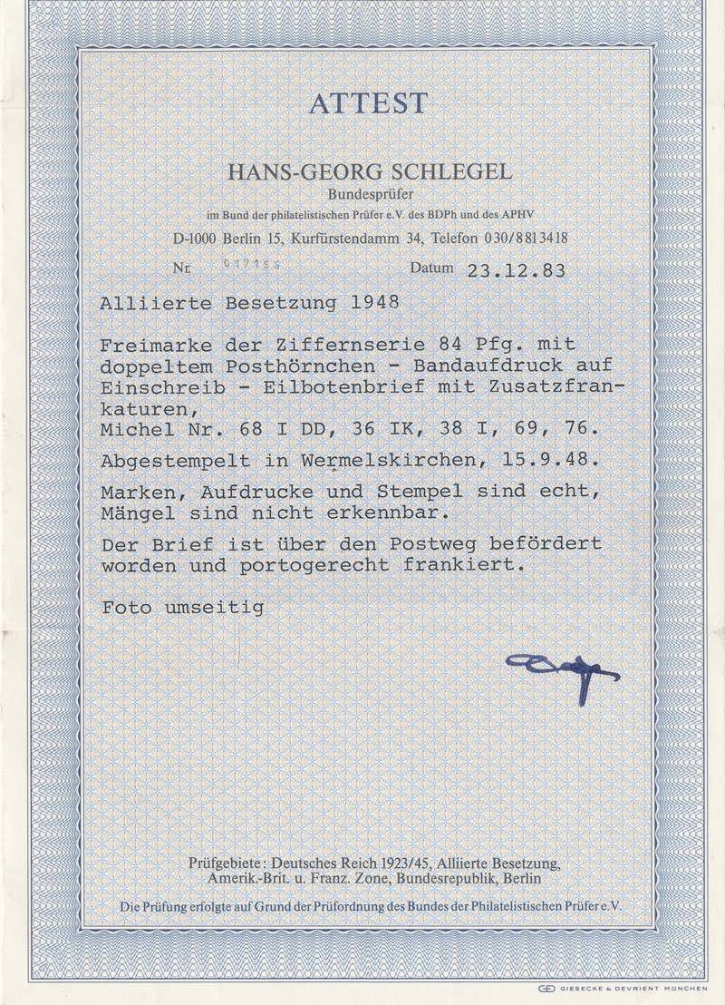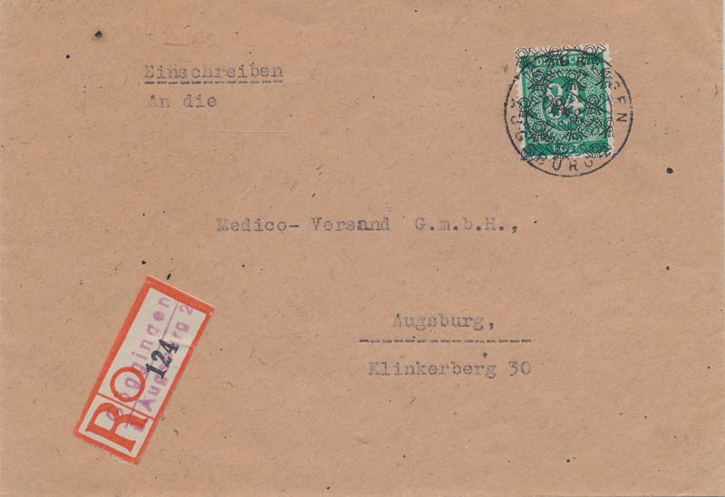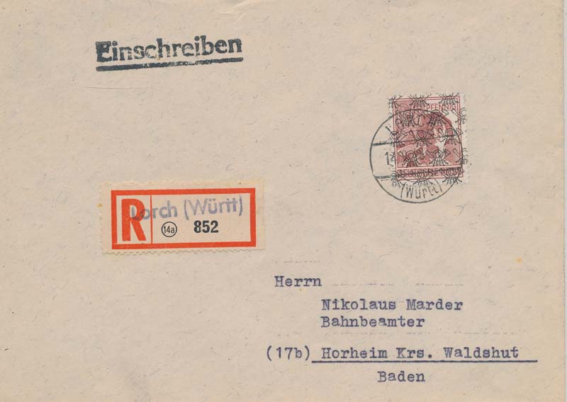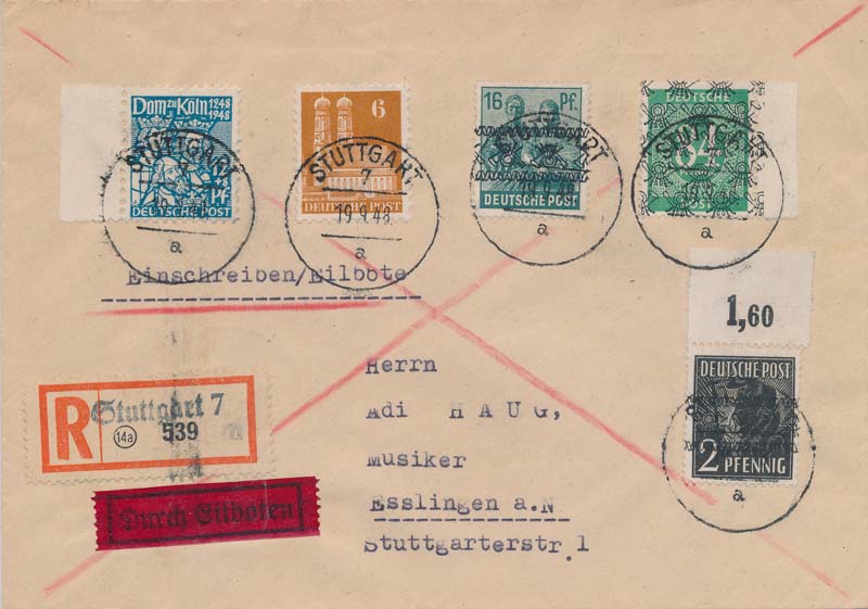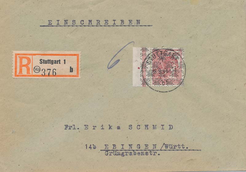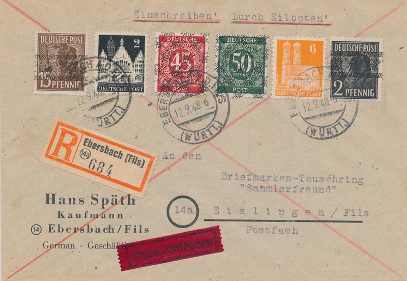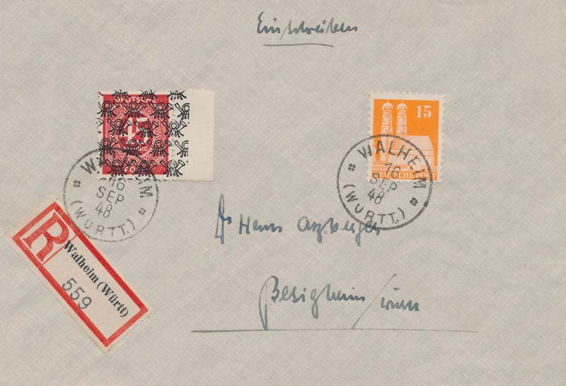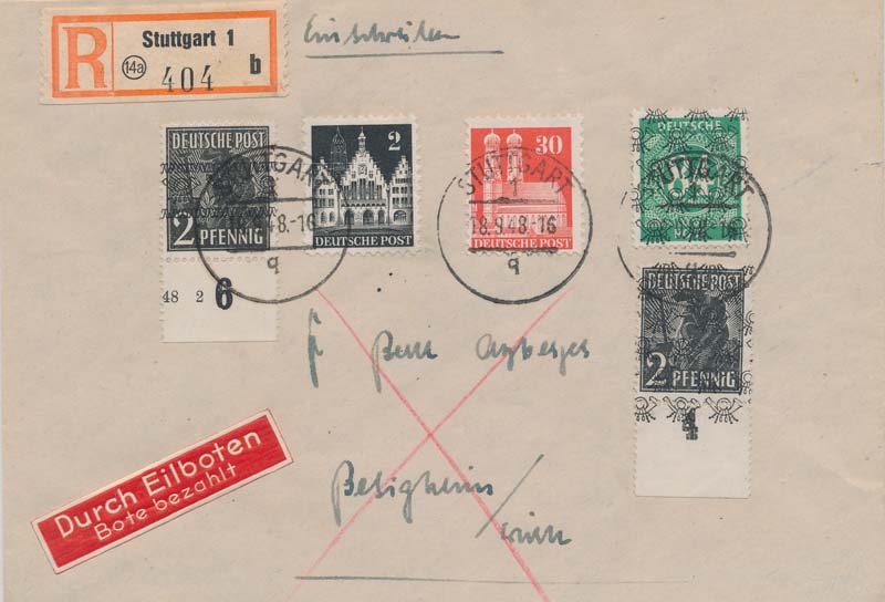 1 bis 10, 15 sowie 25 bis 40 Pf. AM-Post dt. Druck u. weitere Zusatzfrankatur zusammen auf Eil-R-Doppelbf. mit Rückschein ab Gronau vom 1.7.46 nach Schwenningen. Mit AM-Post-Marken seltene Potostufe! |
