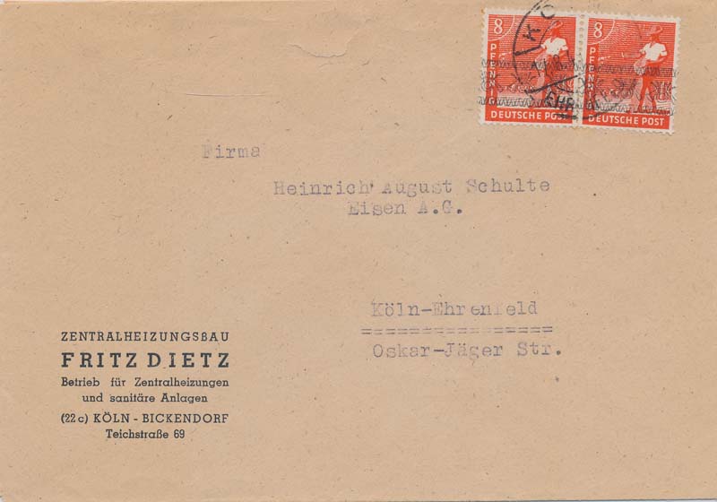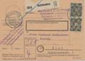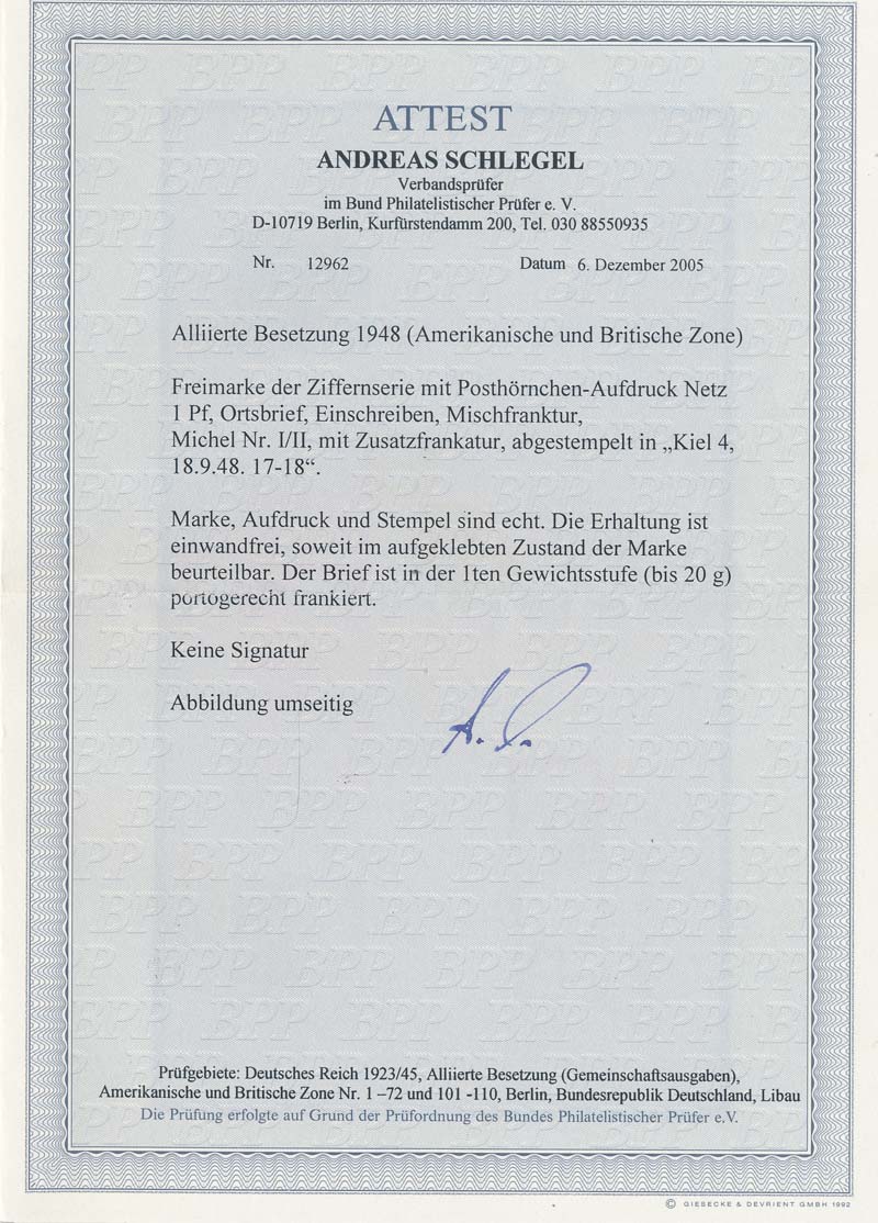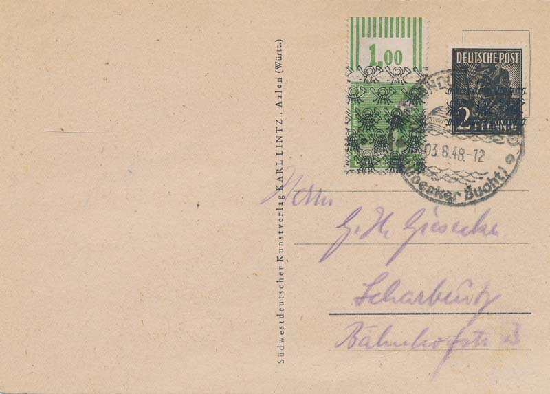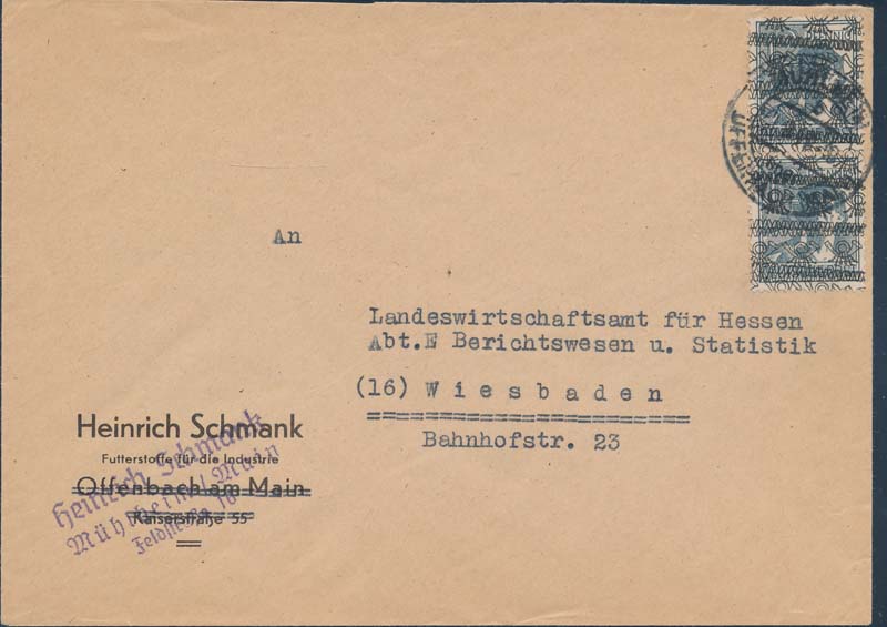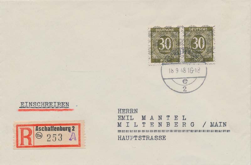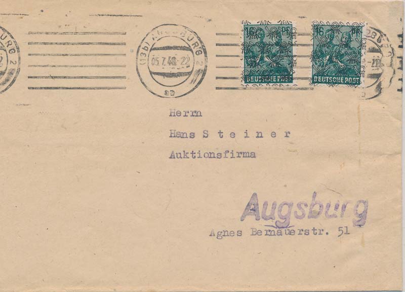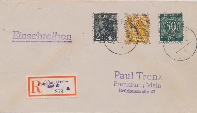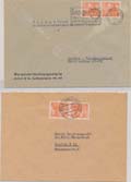 2 Pf. Arbeiter im mit doppelten Bandaufdruck, dabei 1 mal diagonal u. 10 Pf. Ziffer mit Bandaufdruck zusammen auf Bf. ab Frankfurt/M. vom 20.7.48 nach Wiesbaden gepr. Schlegel |