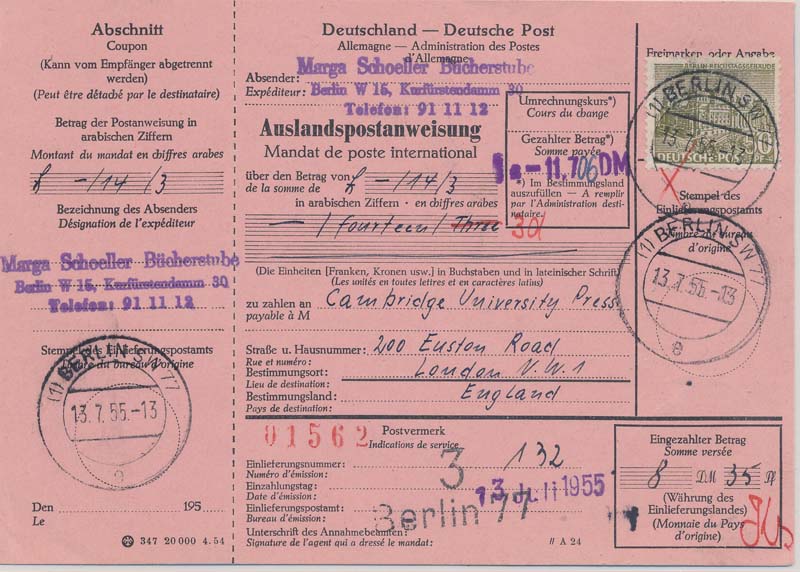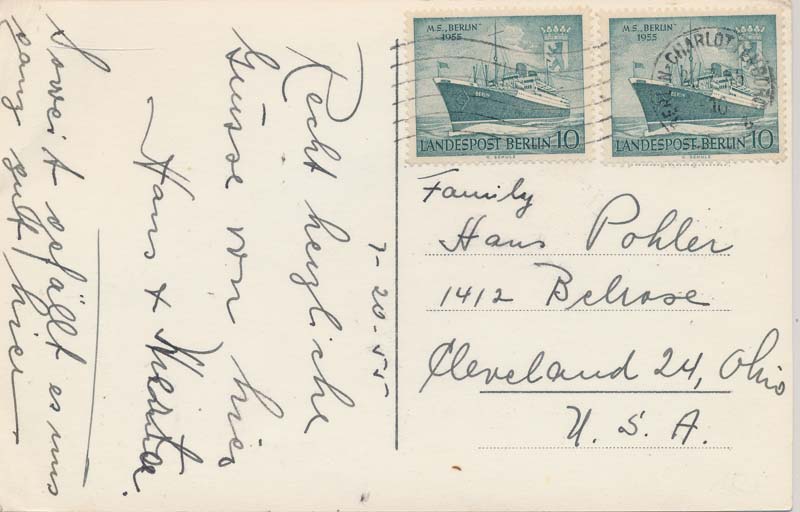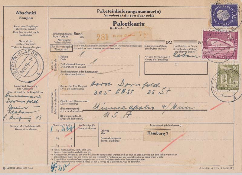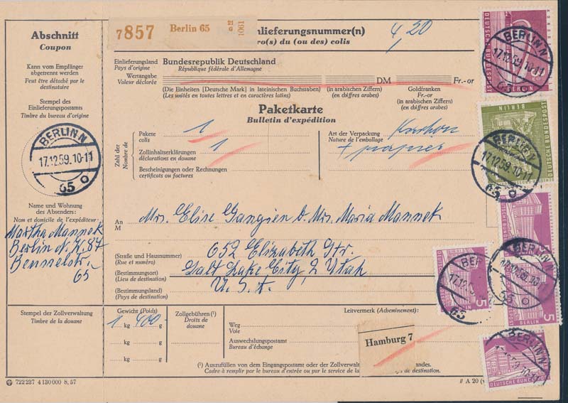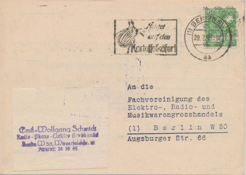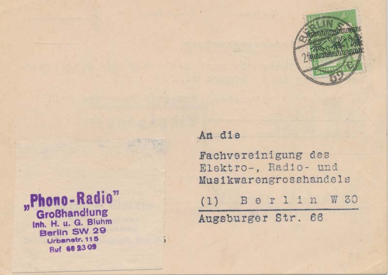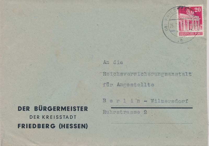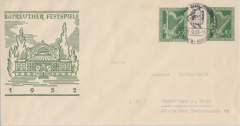 10 Pf. Philharmonie mit bildgleicher Zusatzfrankatur gebr. ab Berlin vom 20.12.53 nach Frankfurt/M. |