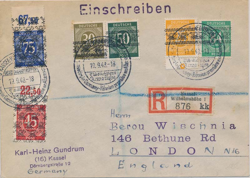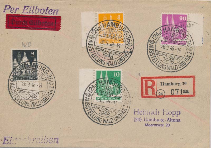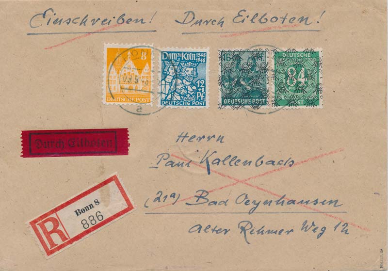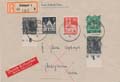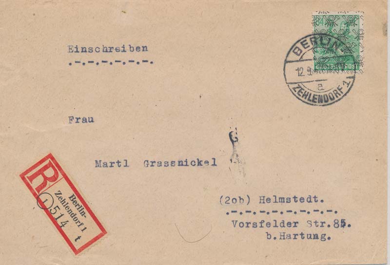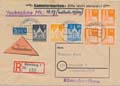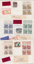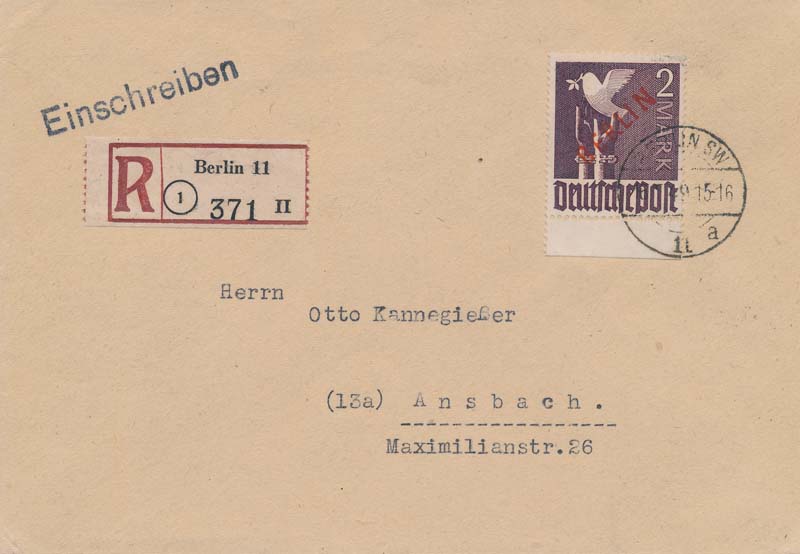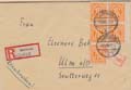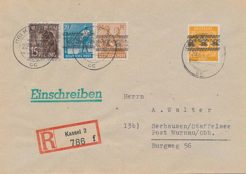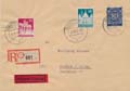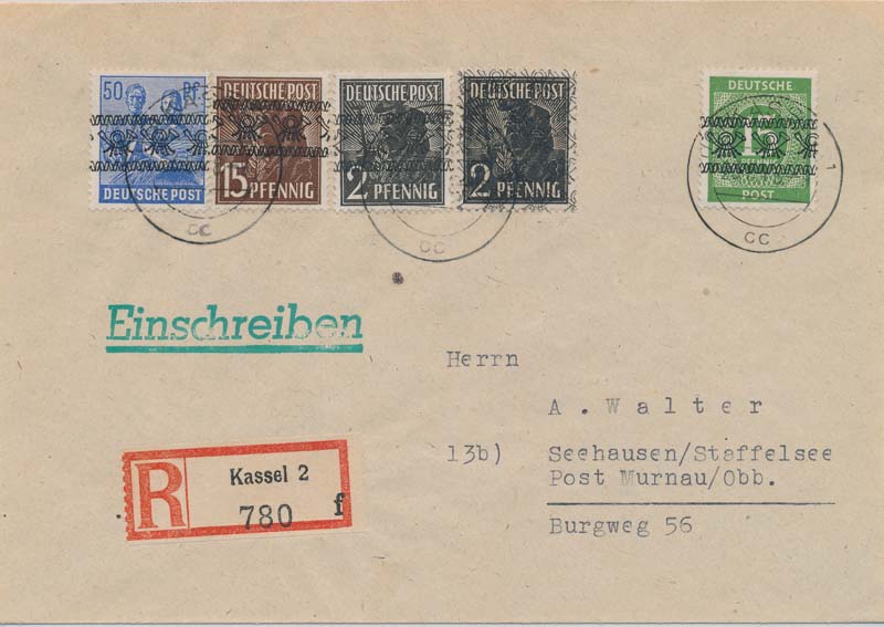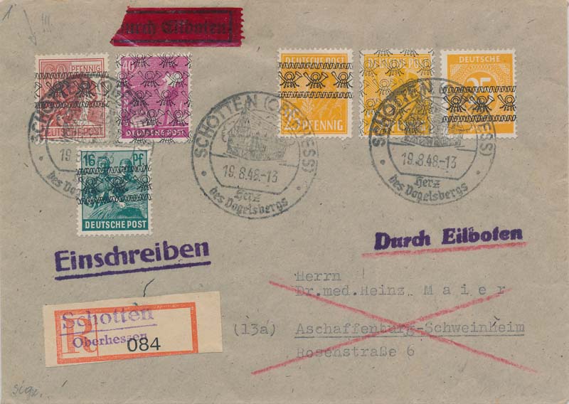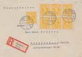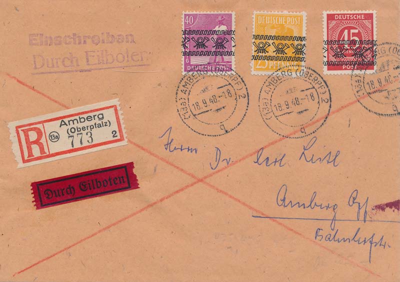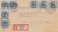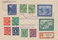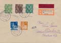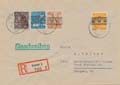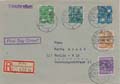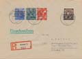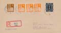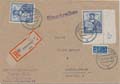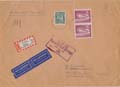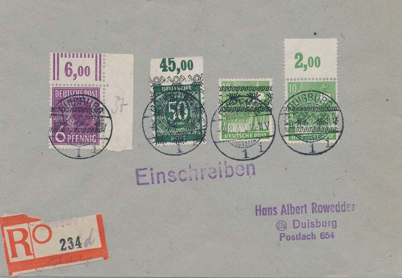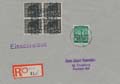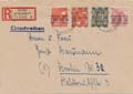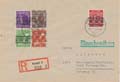 8(2), 12(2), 16( ) u. 3 St. 24 Pf. Schwarzaufdruck zusammen auf Eil-R-Bf. ab Berlin-Zehlendorf vom 3.9.48 nach Helmstedt. Trotz kl. Gebrauchsspuren sehr seltene FDC-Kombination! |