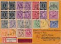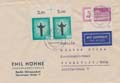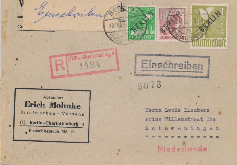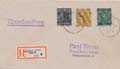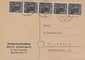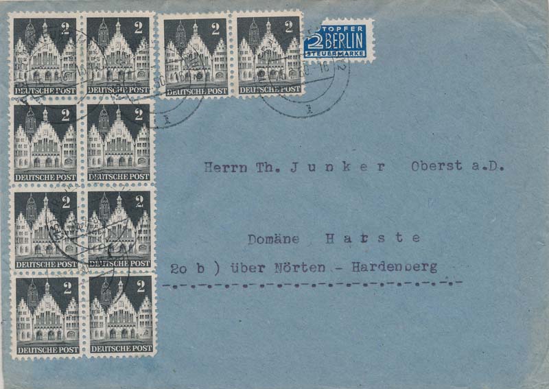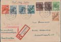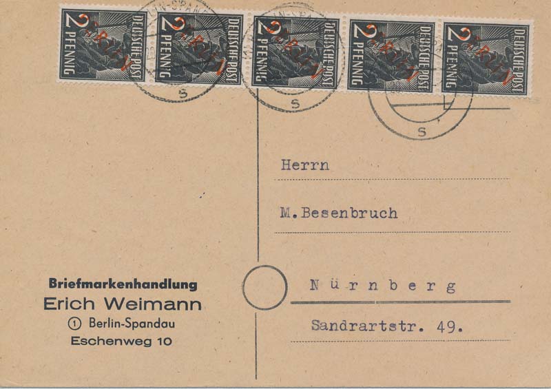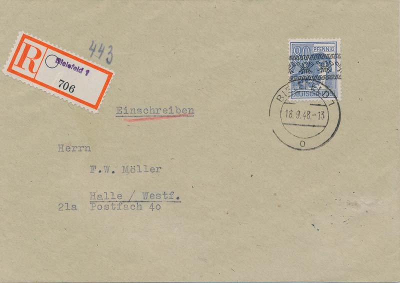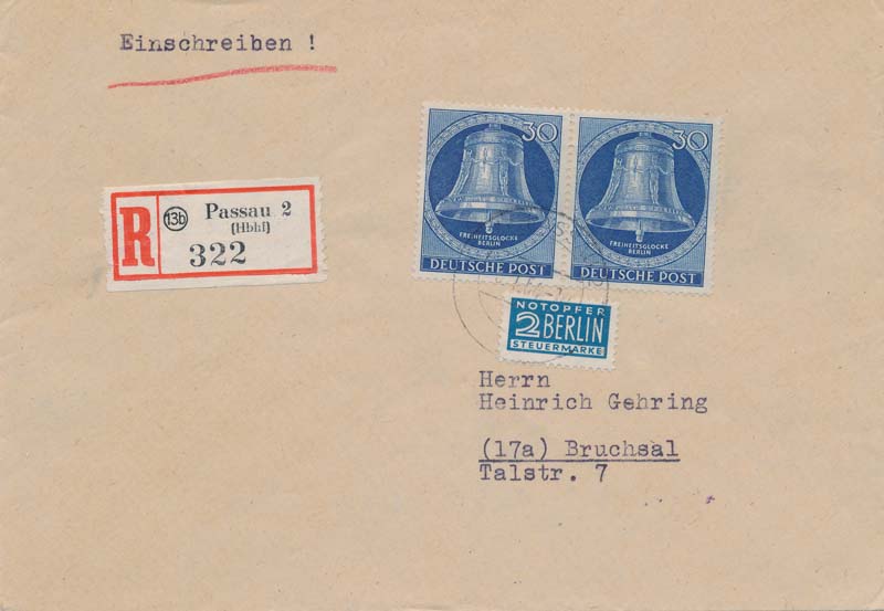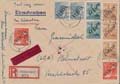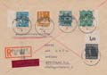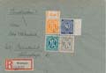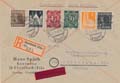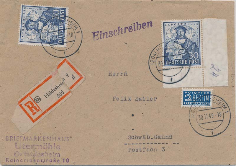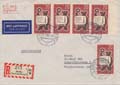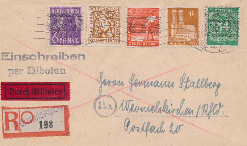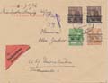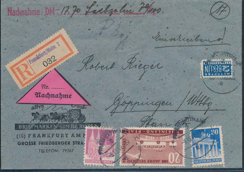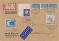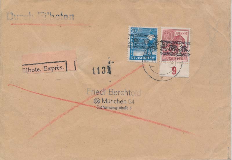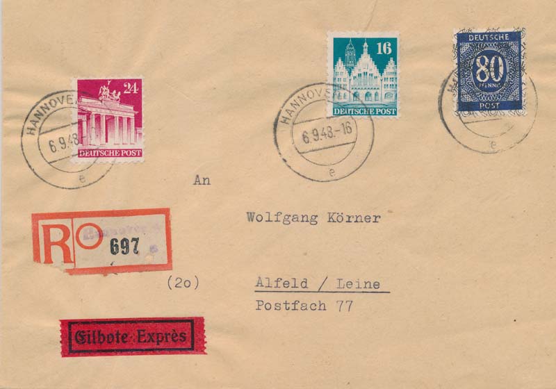 8(2), 12(2), 16( ) u. 3 St. 24 Pf. Schwarzaufdruck zusammen auf Eil-R-Bf. ab Berlin-Zehlendorf vom 3.9.48 nach Helmstedt. Trotz kl. Gebrauchsspuren sehr seltene FDC-Kombination! |