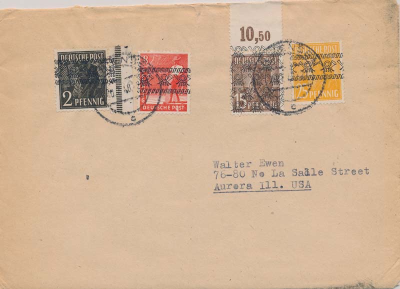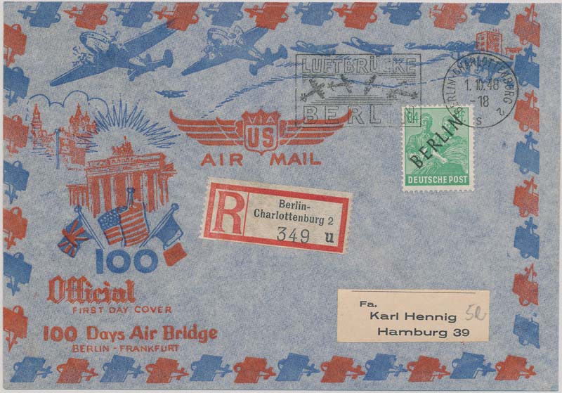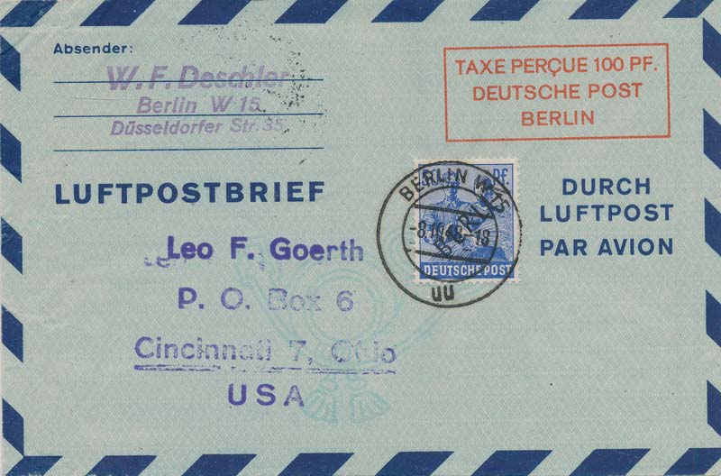 100 Pf. Luftpostbf. Typ II mit Zusatzfrankatur 50 Pf. Schwarzaufdruck gebr. ab Berlin W15 vom 8.10.48 in die USA, innen kein Text gepr. Schlegel |