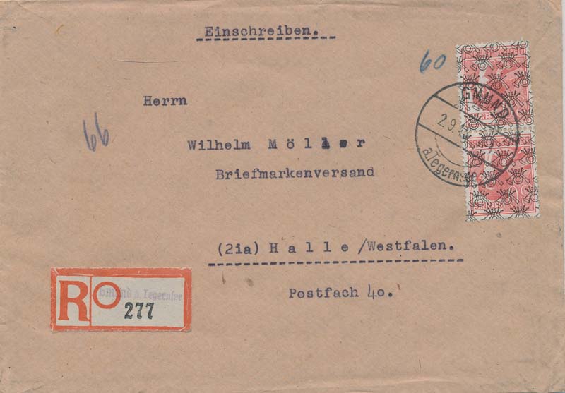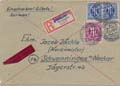 4, 8 u. 16 Pf. AM-Post dt. Druck sowie 80 Pf. Ziffer zusammen auf R-Doppelbf. ab Wissingen vom 13.5.46 nach Osnabrück |
