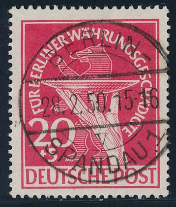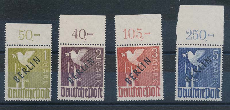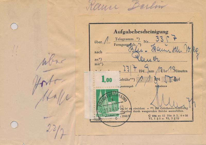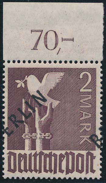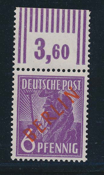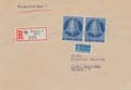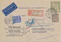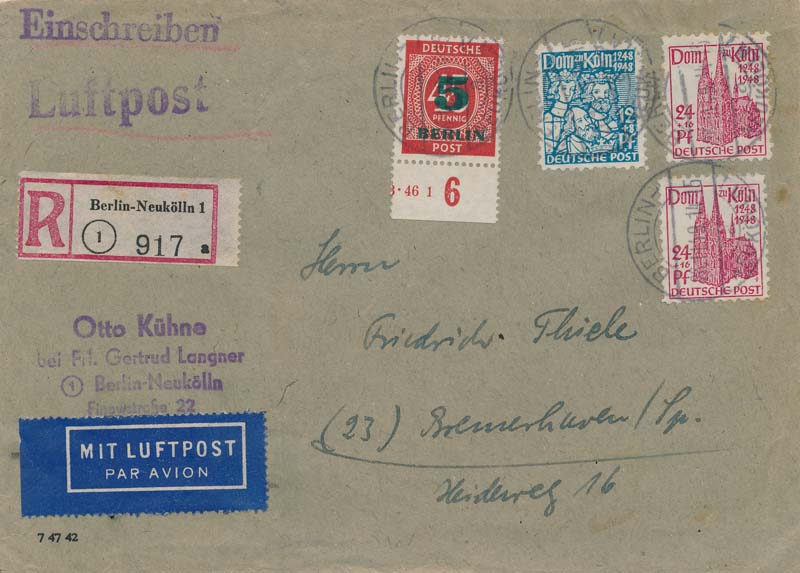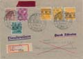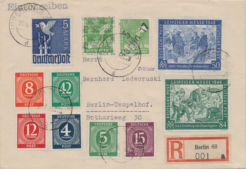 42 Pf. Ziffer mit 5 Mk Taube u. weitere Zusatzfrankatur auf Orts-R-Doppelbf. von Berlin vom 28.6.48 |