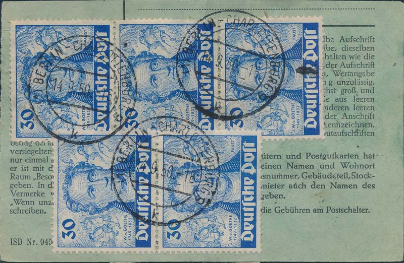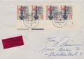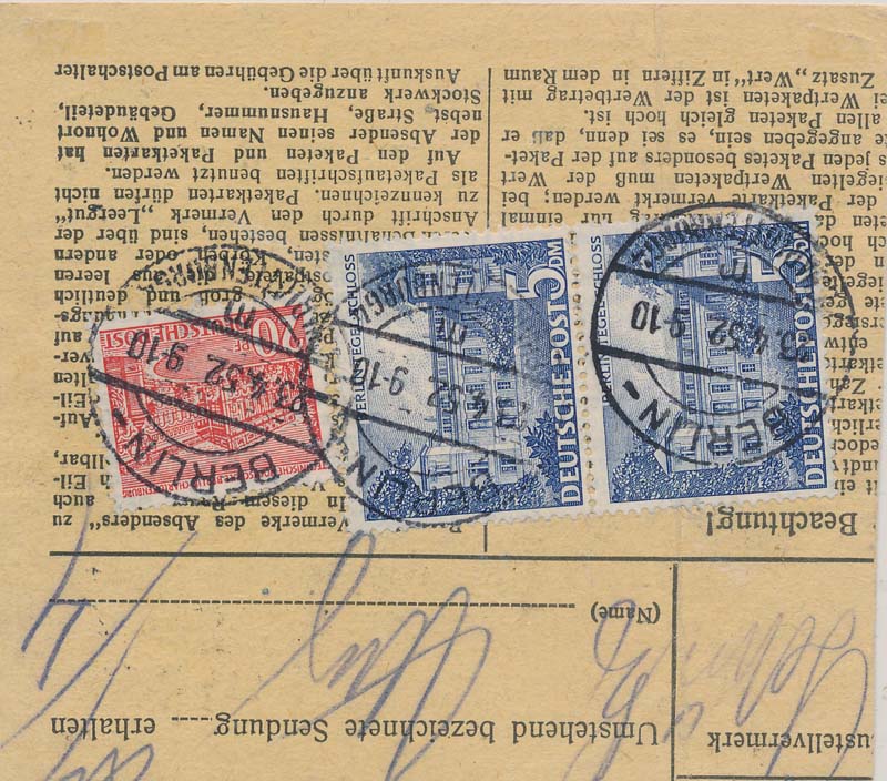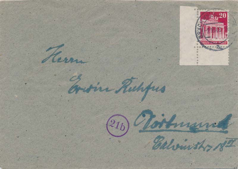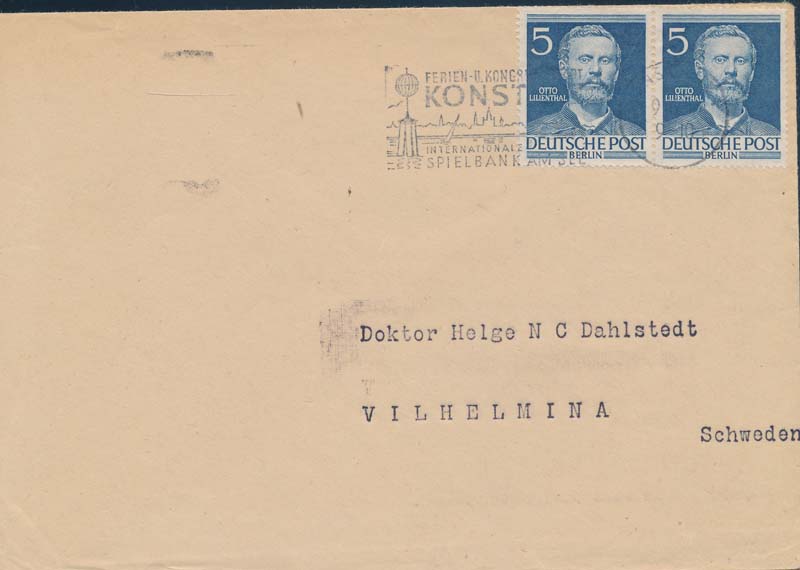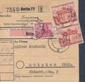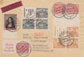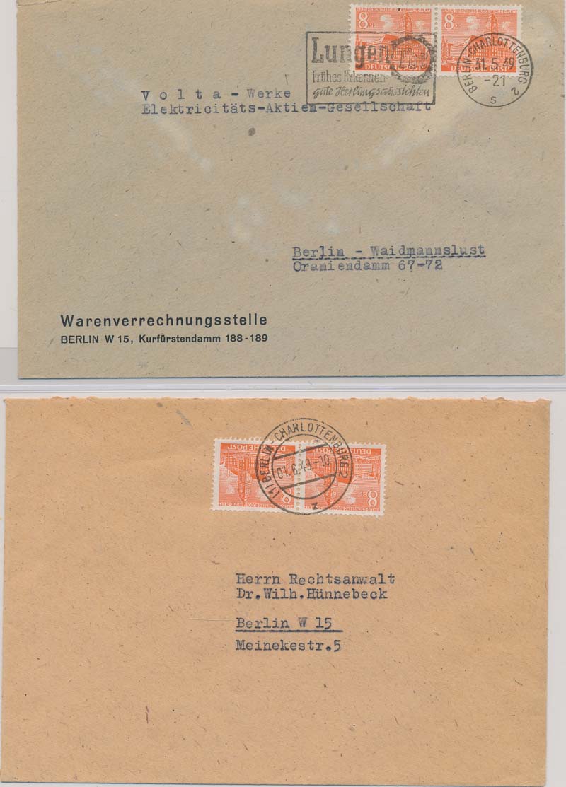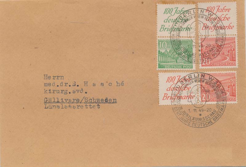 R1a+20 im u. R1b+10 sowie R1a+20 Pf. Bauten je im zusammen auf Auslands-Doppelbf. ab Berlin mit ESST vom 1.11.49 nach Schweden |