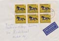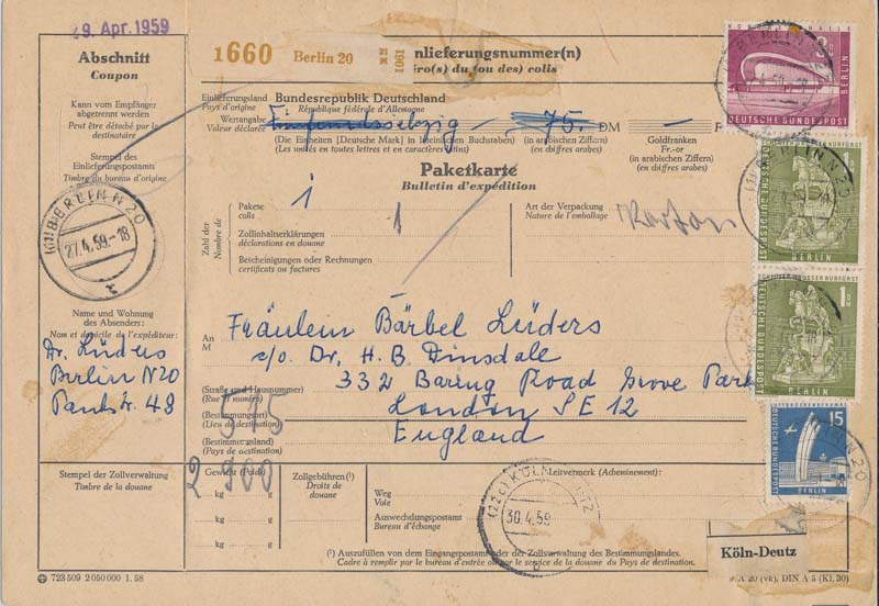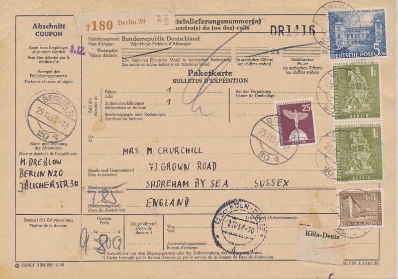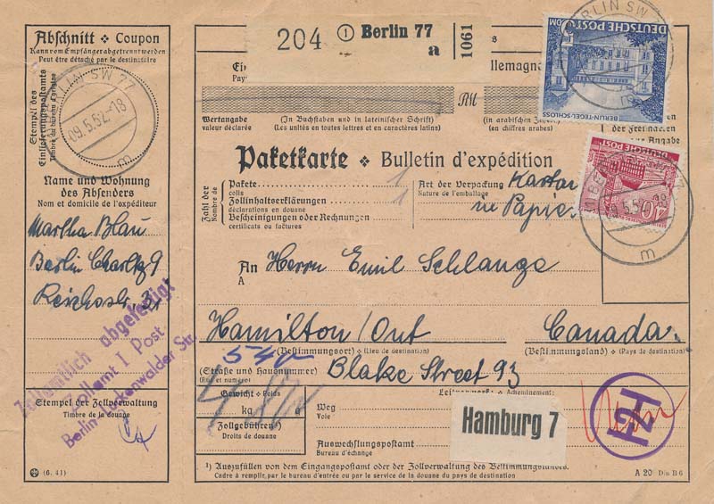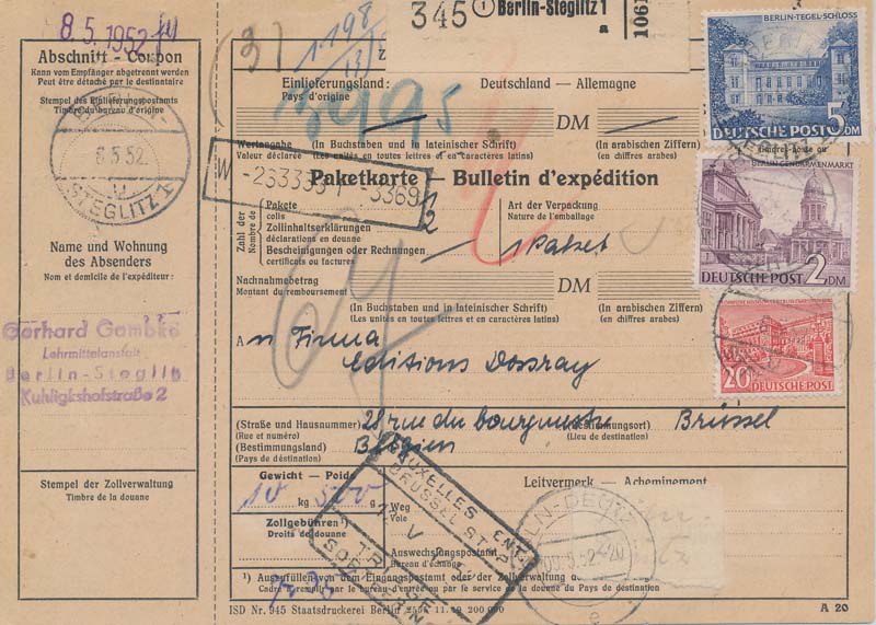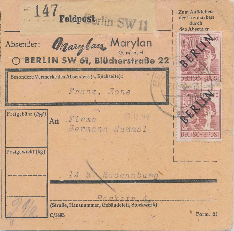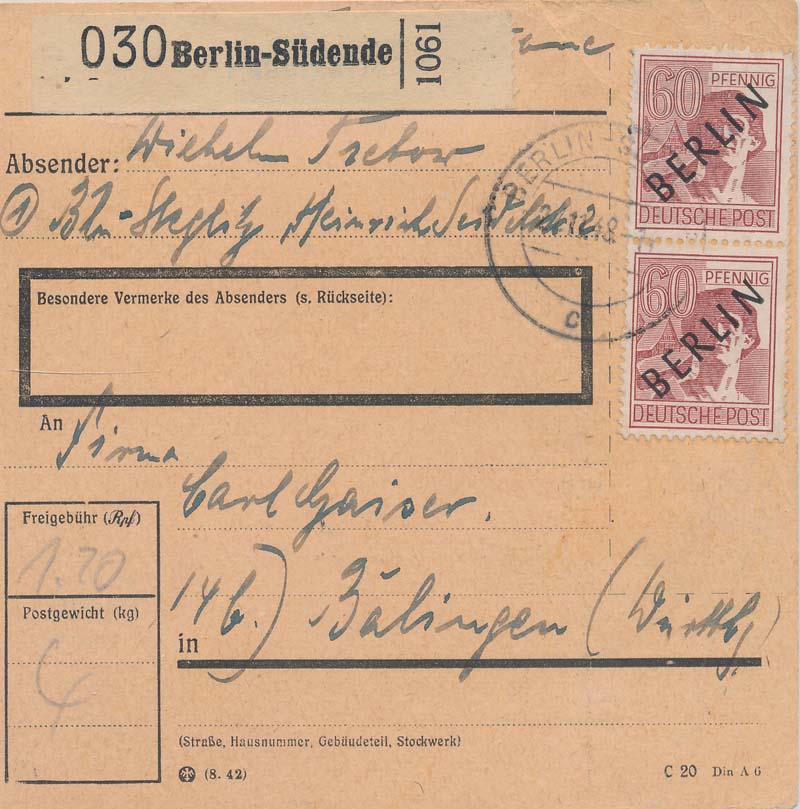 R1a+20 im u. R1b+10 sowie R1a+20 Pf. Bauten je im zusammen auf Auslands-Doppelbf. ab Berlin mit ESST vom 1.11.49 nach Schweden |