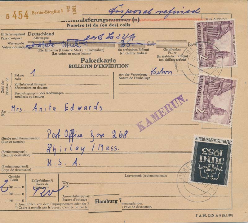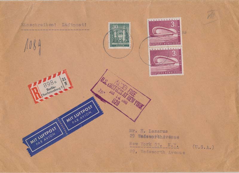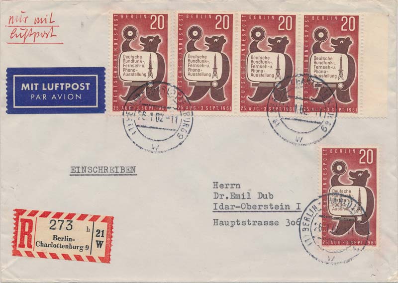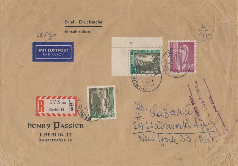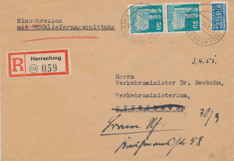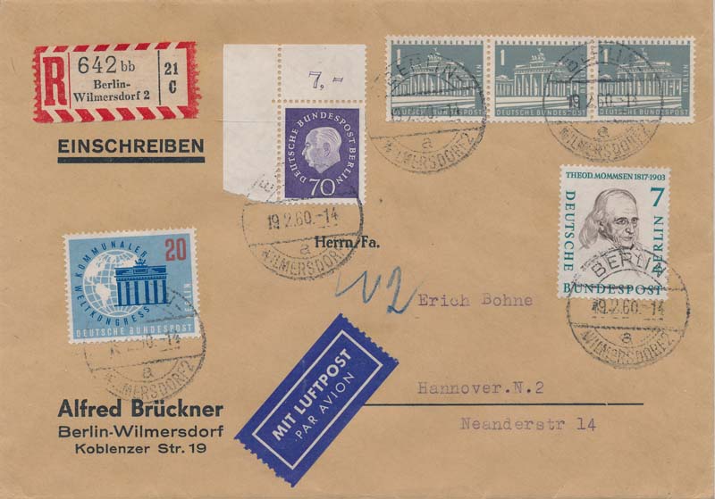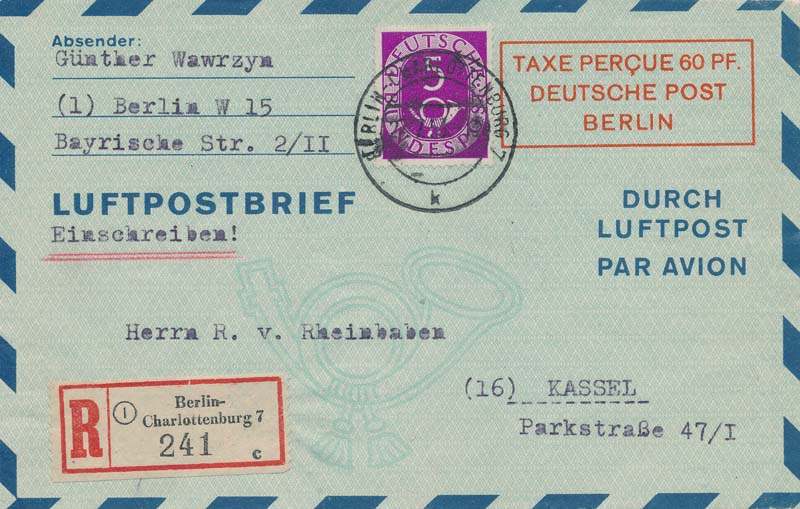 60 Pf. Luftpostbf. mit Zusatzfrankatur Bund 5 Pf. Posthorn gebr. als Lp-R-Bf. ab Berlin-Charlottenburg vom 27.7.53 nach Cassel |