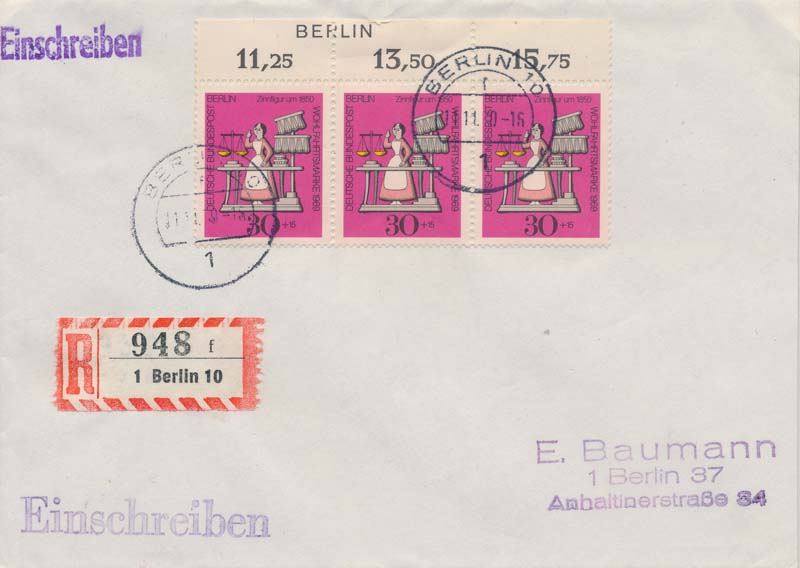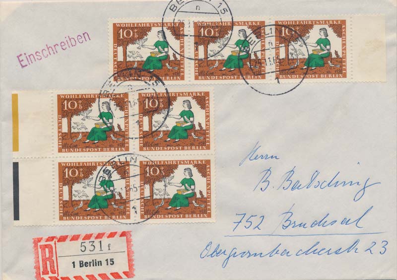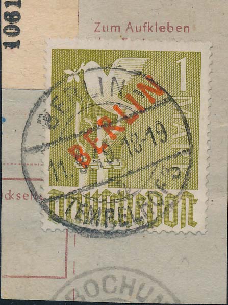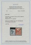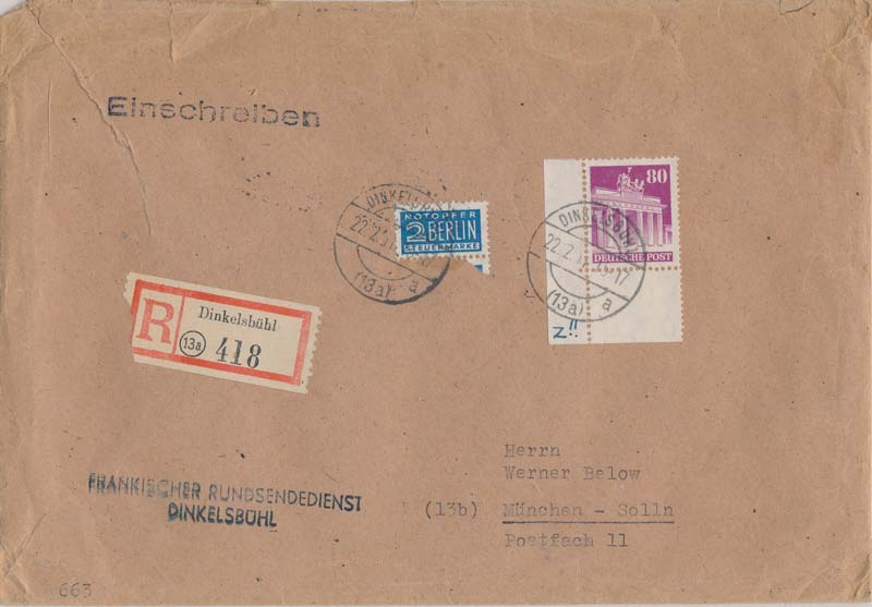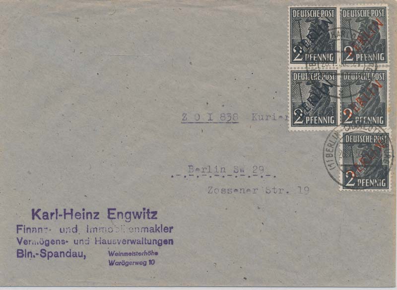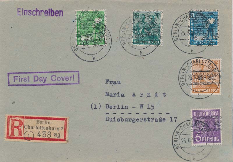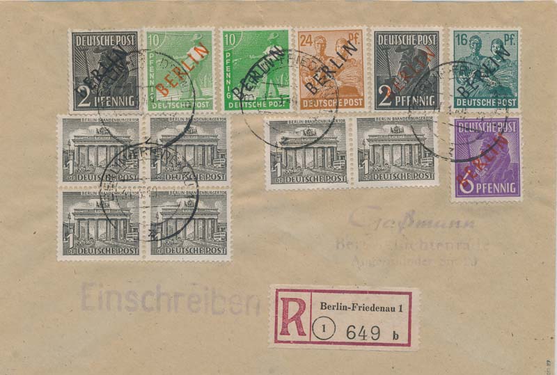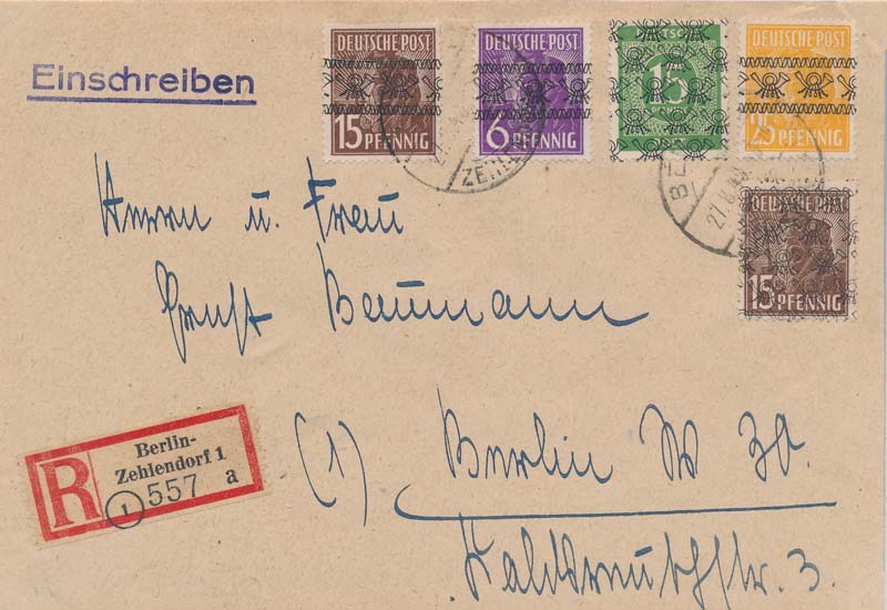 15 u. 40 Pf. Rotaufdruck mit 10 Pf. Schwarzaufdruck sowie 1 Pf. Bauten zusammen auf Orts-R-Bf. ab Berlin-Zehlendorf vom 21.3.49. Sehr seltene FDC-Kombination! für die 40 Pf. Rotaufdruck! |