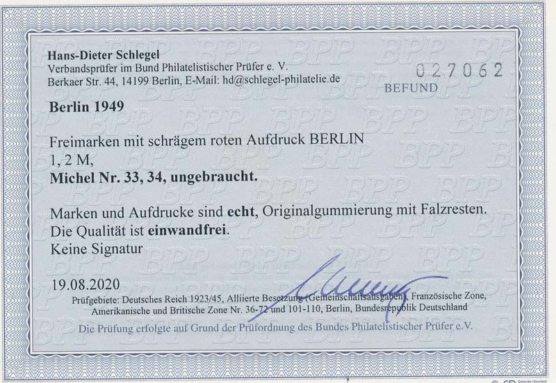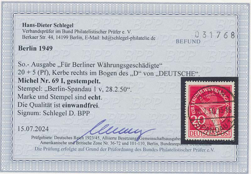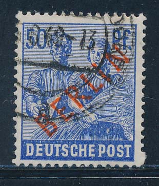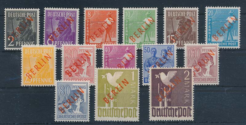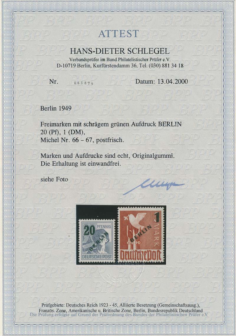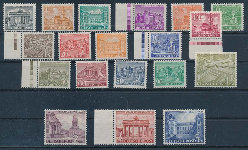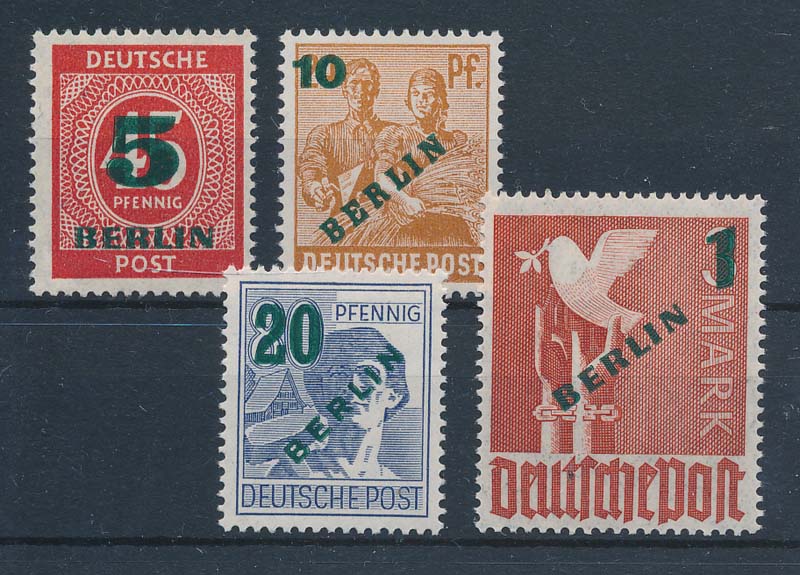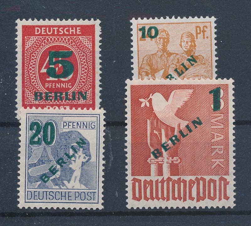 15 u. 40 Pf. Rotaufdruck mit 10 Pf. Schwarzaufdruck sowie 1 Pf. Bauten zusammen auf Orts-R-Bf. ab Berlin-Zehlendorf vom 21.3.49. Sehr seltene FDC-Kombination! für die 40 Pf. Rotaufdruck! |
