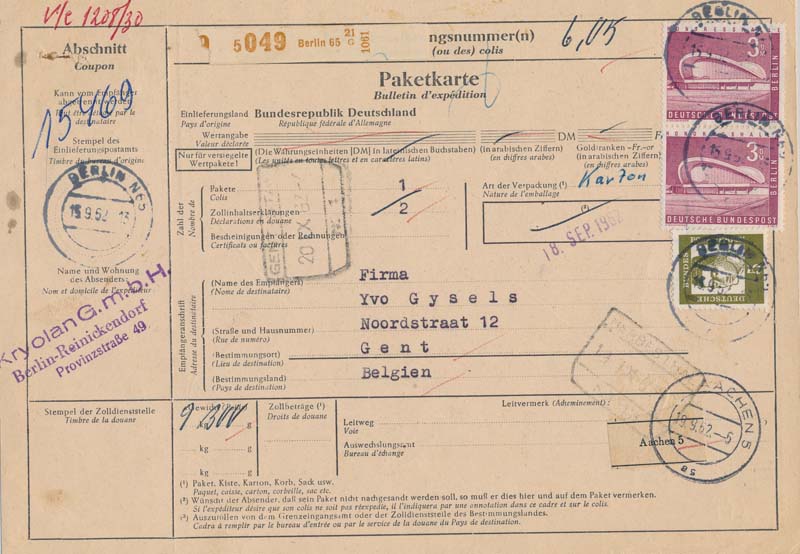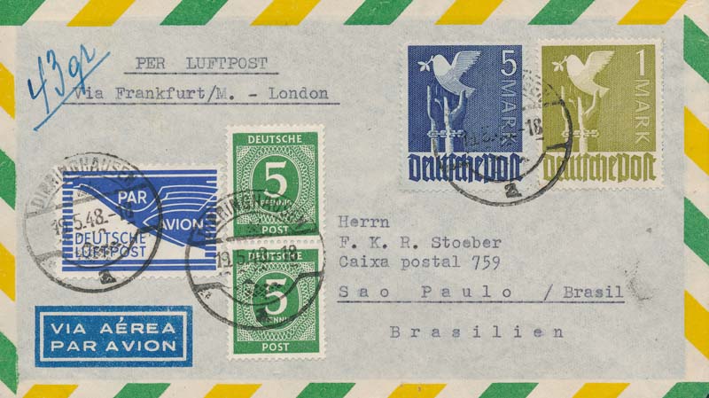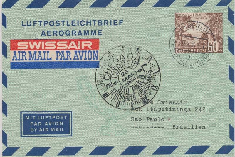 60 Pf. Luftpostbf. Ausg. 1954 gebr. ab Berlin-Zentralflughafen vom 20.5.54 über Zürich (Stpl. vom 27.5.54) nach Brasilien, innen ohne Text aber mit AKS! |