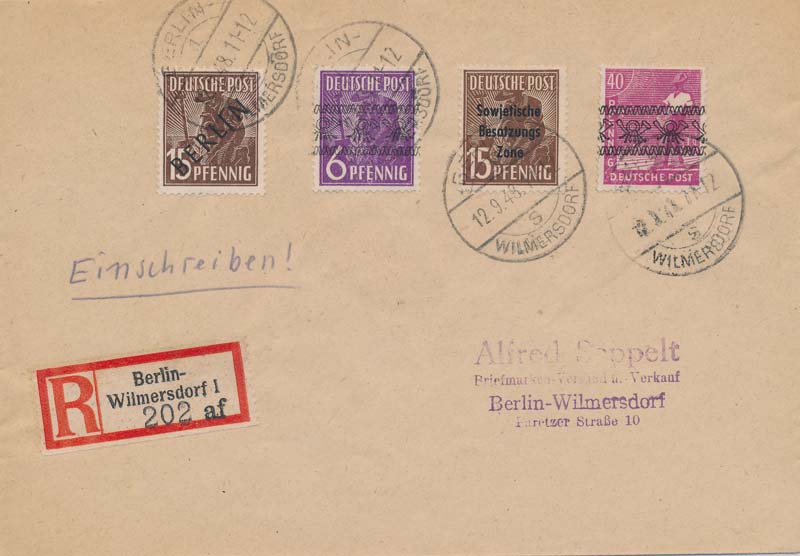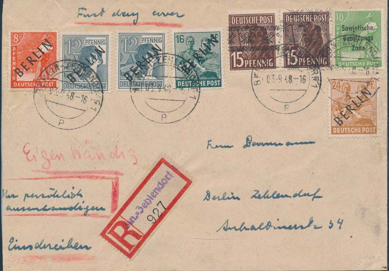 8, 12(2), 16 u. 24 Pf. Schwarzaufdruck u. Zusatzfrankatur Bizone/SBZ zusammen auf Orts-R-Doppelbf. eigenhändig von Berlin-Zehlendorf vom 3.9.48. Trotz kl. Gebrauchsspuren sehr seltene FDC-Kombination! |