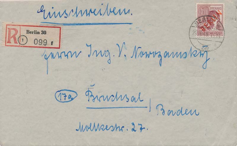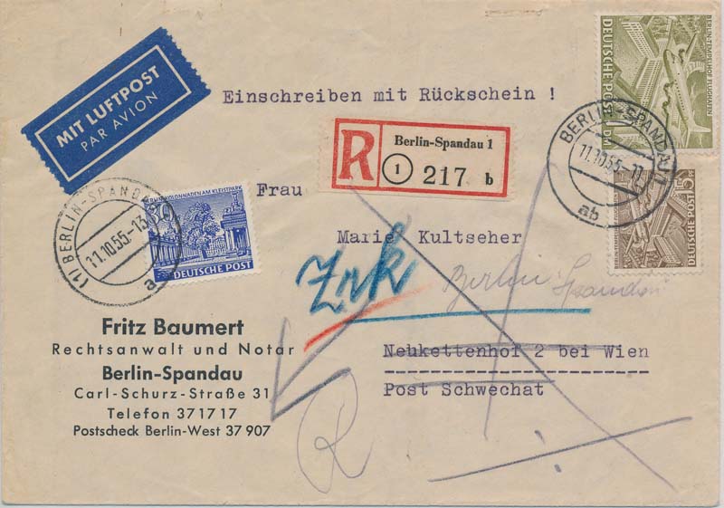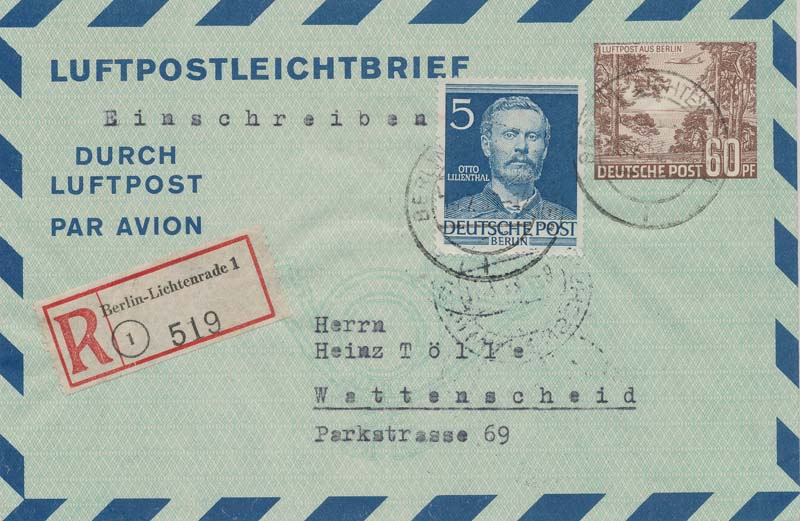60 Pf. Luftpostbf. Ausg. 1953 mit Zusatzfrankatur 5 Pf. Männer I gebr. als Lp-R-Bf. ab Berlin-Lichtenrade 1 vom 13.7.53 nach Wattenscheid |