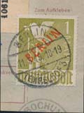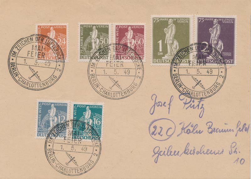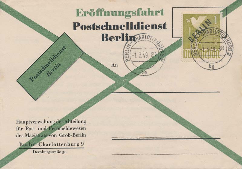 1 Mk Schwarzaufdruck auf amtl. FDC zur Eröffnungsfahrt Postschnelldienst Berlin gestpl. Berlin-Charlottenburg 2 vom 1.3.49 mit Einlagezettel |