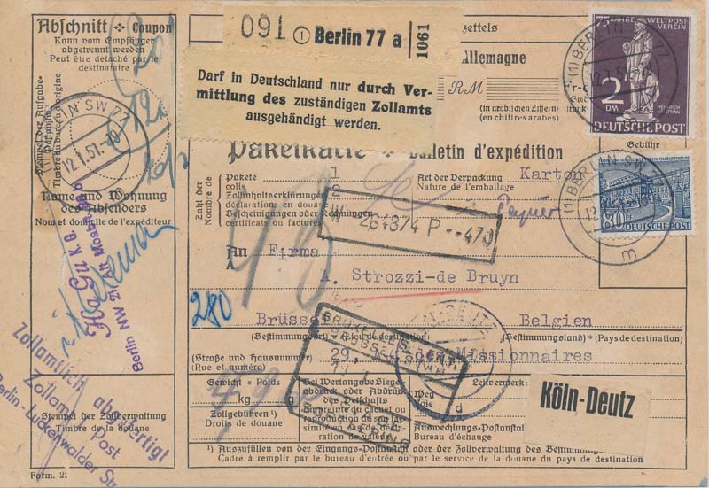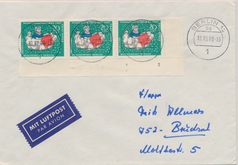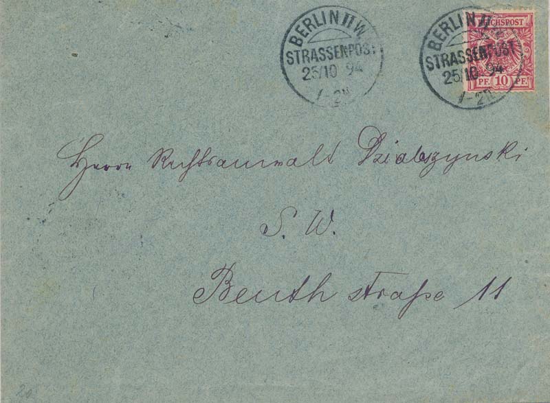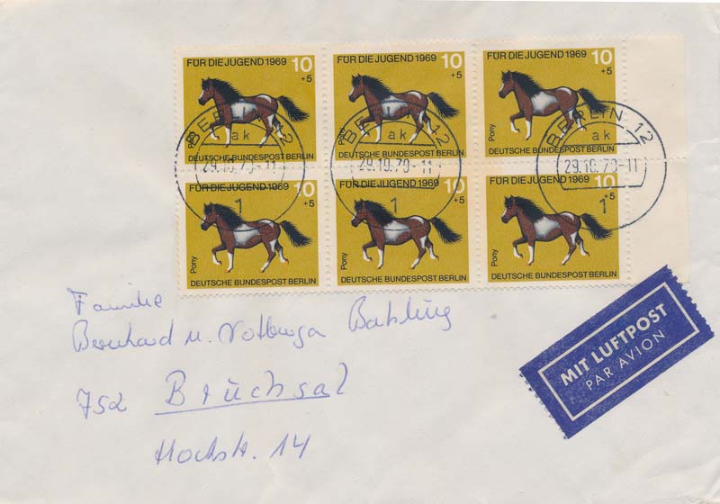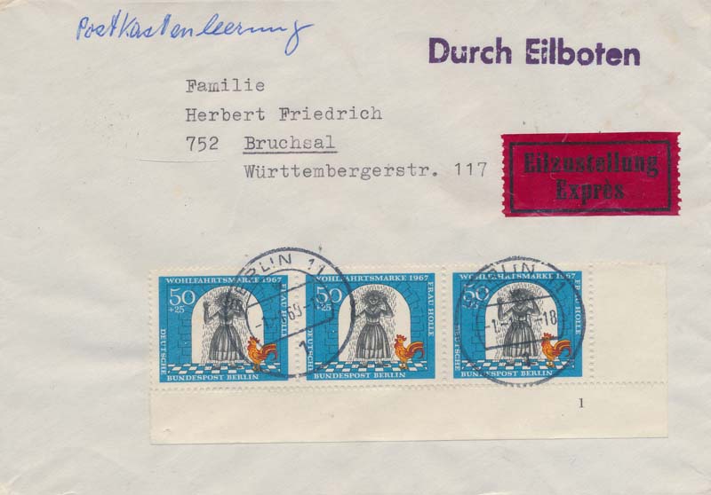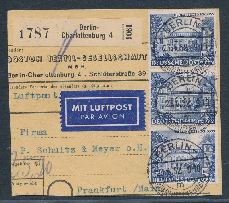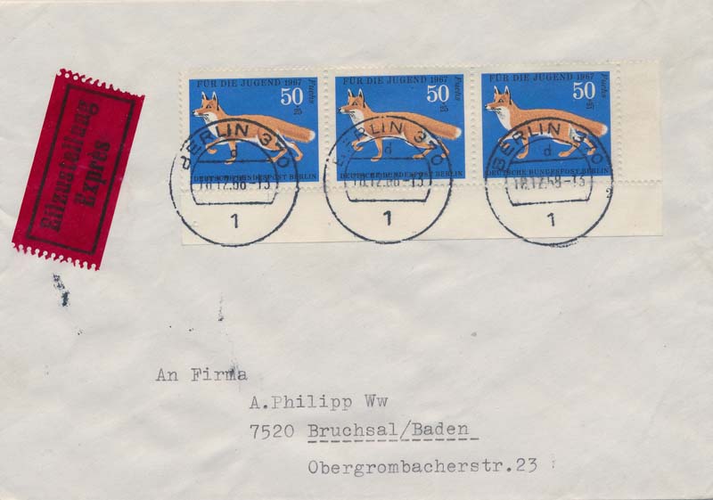 "BERLIN II W. STRASSENPOST" vom 25.10.94 2 mal glasklar auf Ortsbf. mit EF DR 10 Pf. Krone-Adler, auf frankierte Belege selten! Umschlag kl. Mängel KBHW 783 |
