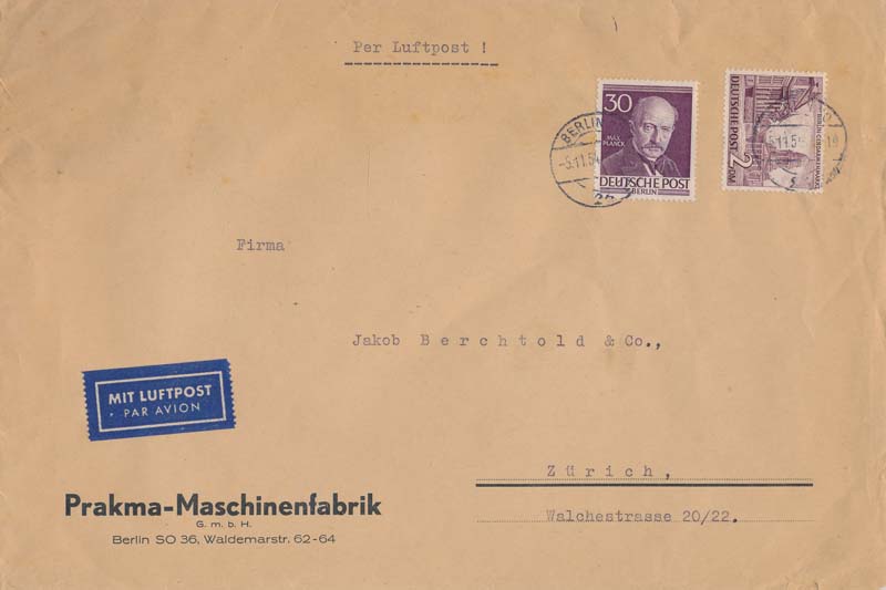 60 Pf. Luftpostbf. gebr. ab Berlin-Charlottenburg vom 18.7.51 in die Schweiz |