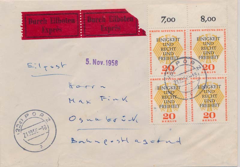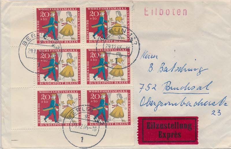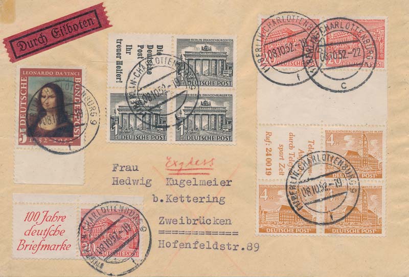 angegebene ZD u. Zusatzfrankatur zusammen auf Eilbf. ab Berlin-Charlottenburg 9 vom 8.10.52 nach Zweibrücken |