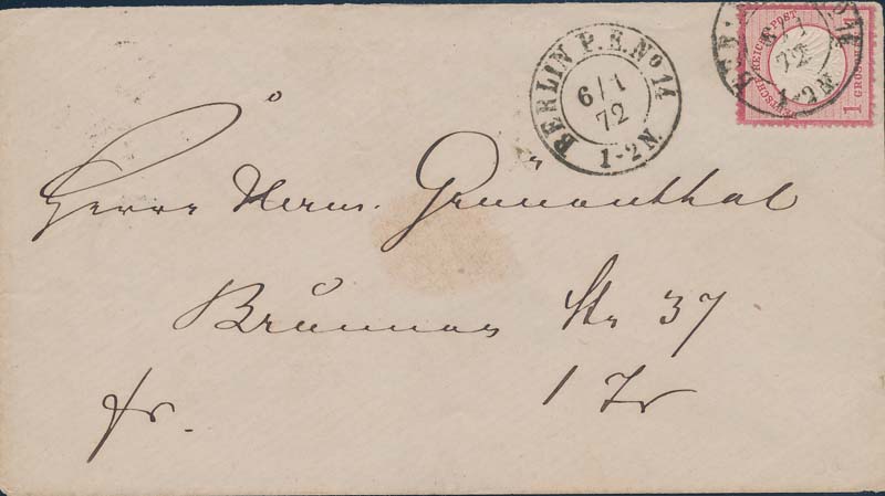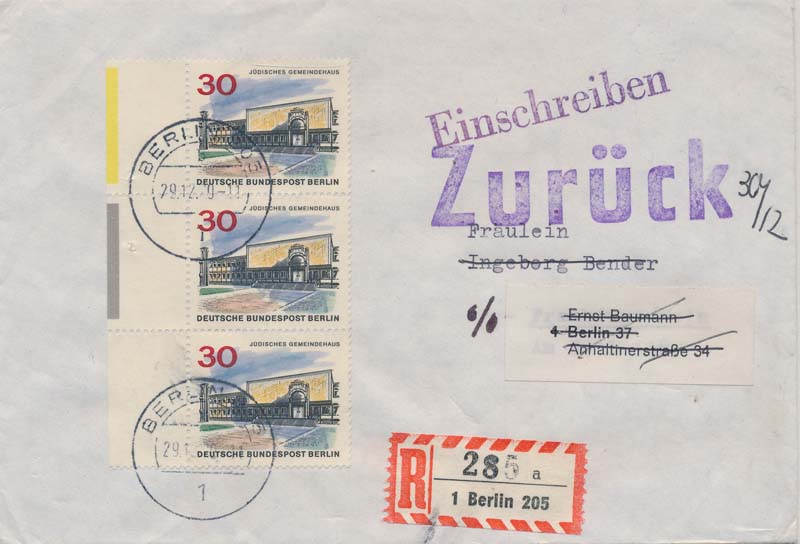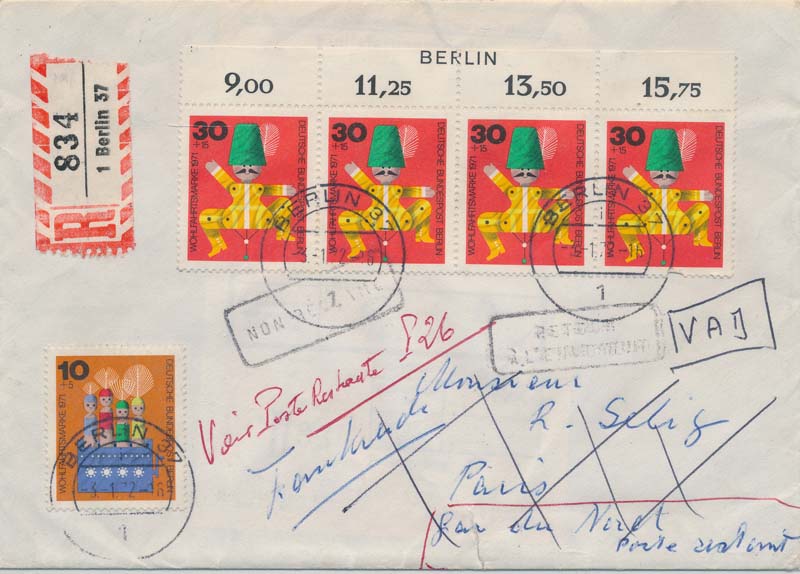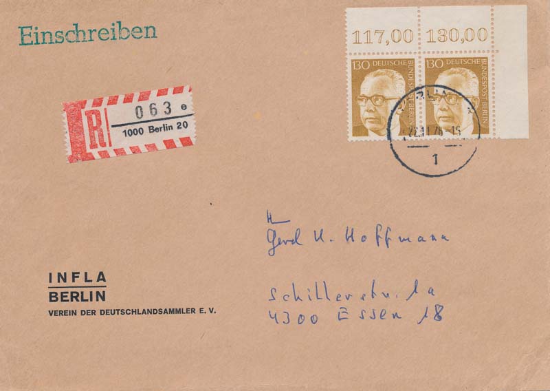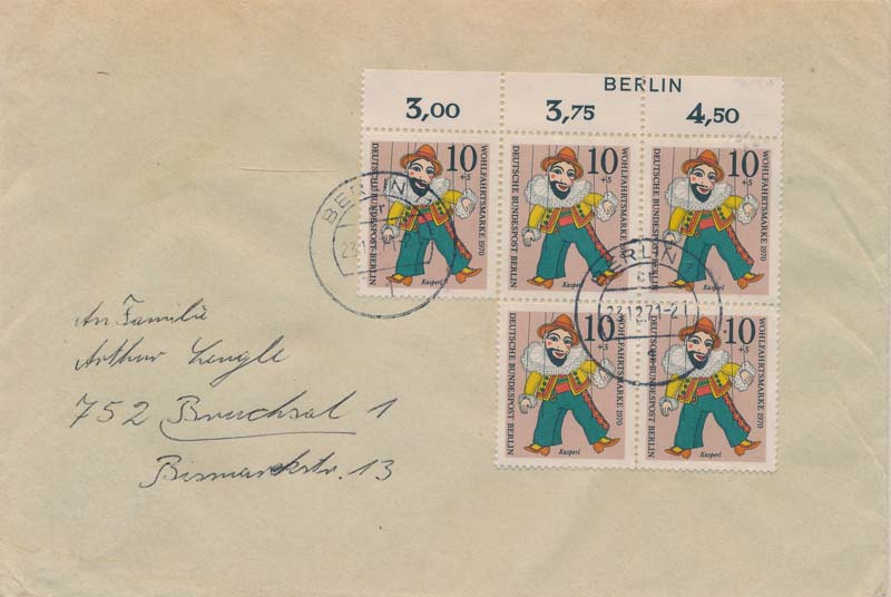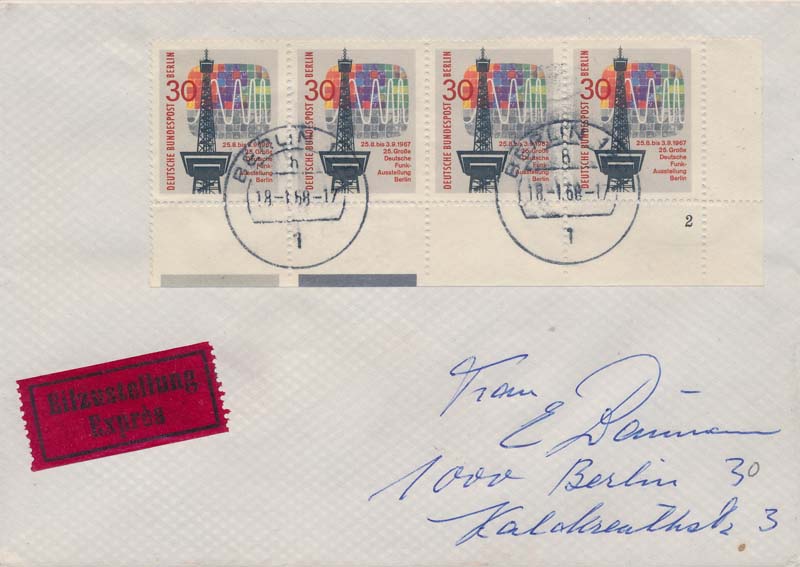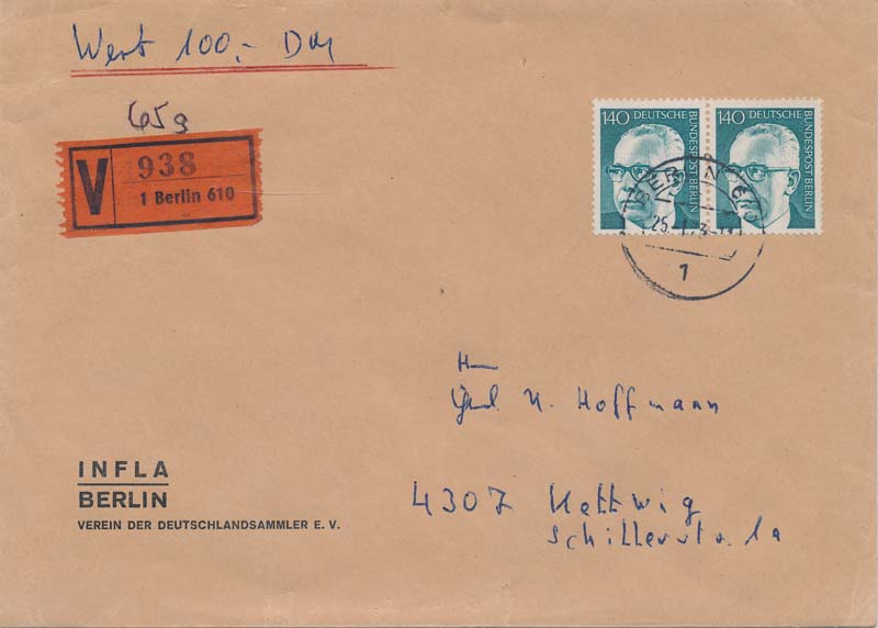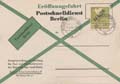 "BERLIN. P.E. No.14" vom 6.1.72 2mal glasklar auf Ortsbf. mit DR 1 Gr. kl. Schild KBHW 402b |