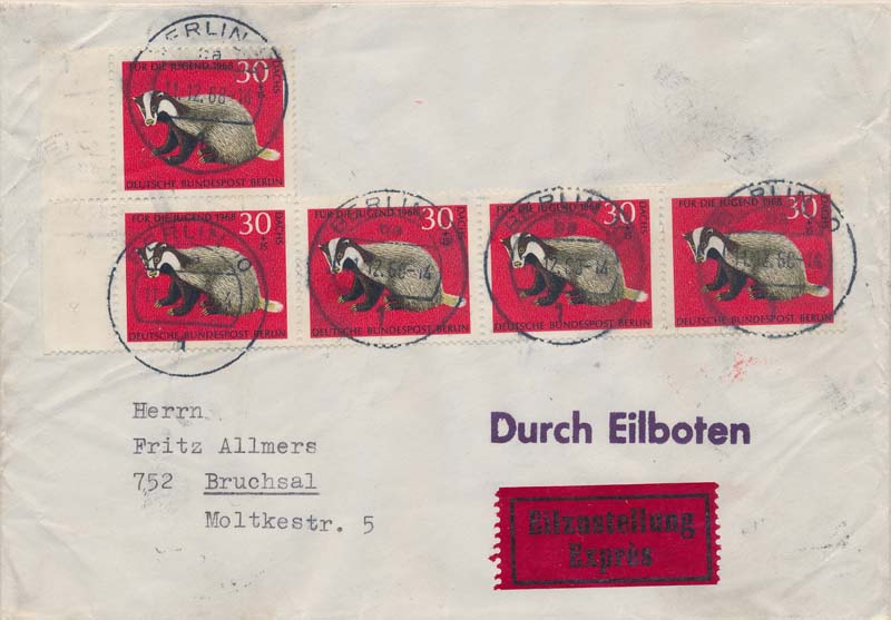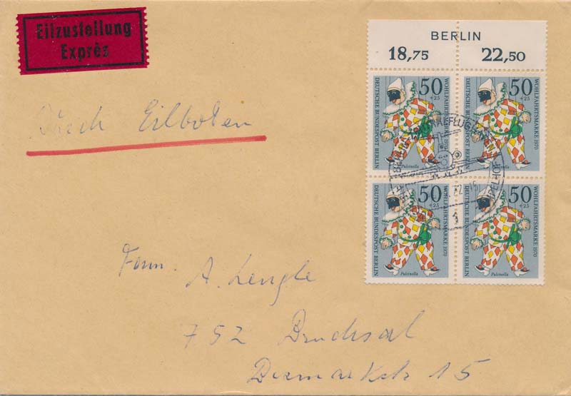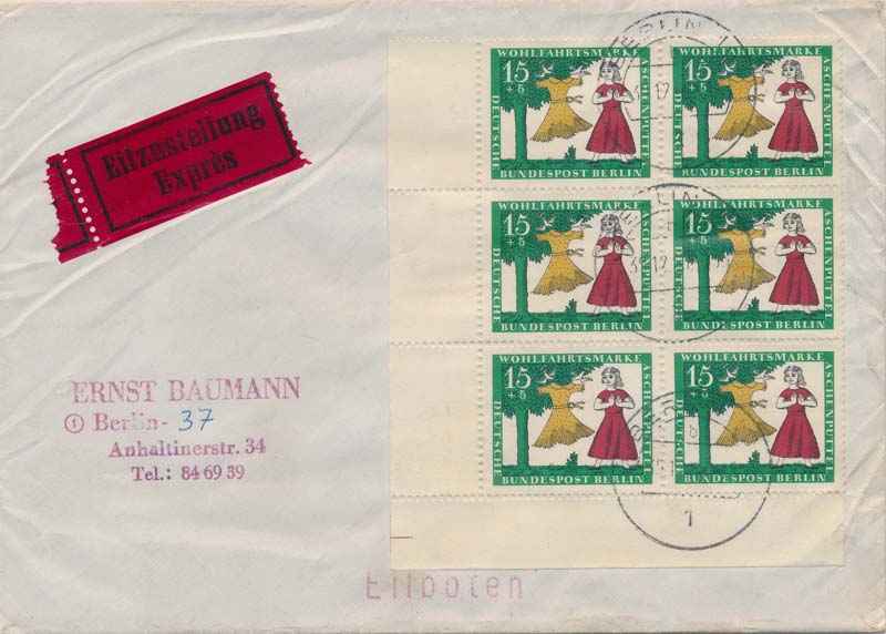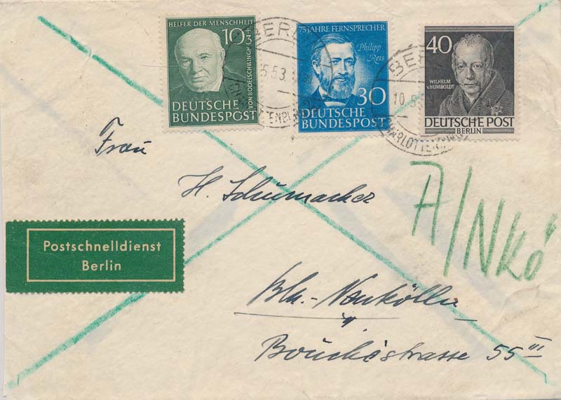 40 Pf. Männer I mit Bund 10 Pf. Wohlfahrt 1951 u. Reis zusammen auf Postschnelldienstbf. von Berlin-Charlottenburg v. 10.5.53 nach Berlin-Neukölln |
