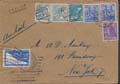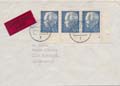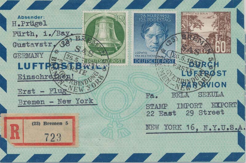 60 Pf. Luftpostbf. Ausg. 1952 mit Zusatzfrankatur 10 Pf. Glocke rechts u. Beethoven gebr. als Lp-R-Überseebf. ab Bremen v. 26.5.52 (Erstflug) in die USA |