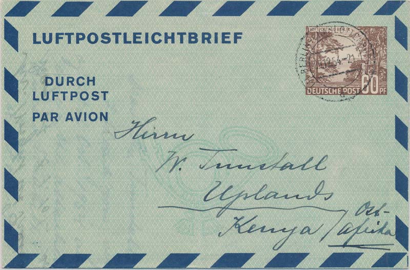 60 Pf. Luftpostbf. Ausg. 1953 gebr. ab Berlin-Charlottenburg vom 29.12.54 nach Kenya |