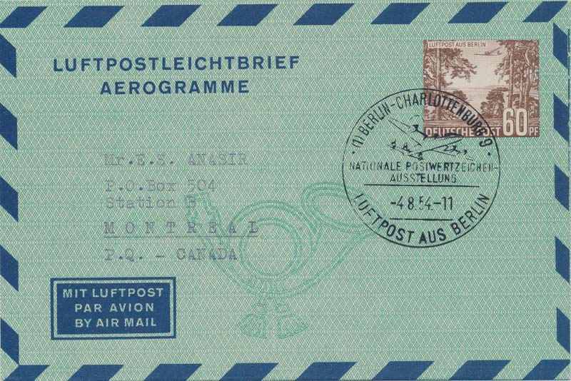 60 Pf. Luftpostbf. Ausg. 1954 gebr. ab Berlin-Charlottenburg vom 4.8.54 nach Canada, innen ohne Text |