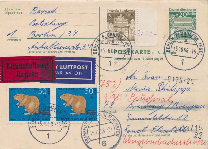 20 Pf. Dt. Bauwerke Doppelkarte mit Zusatzfrankatur gebr. als Lp-Eilkarte ab Berlin-Flughafen Tegel vom 15.10.68 nach Freiburg u. weiter nach Bruchsal Antwort ungebr. |